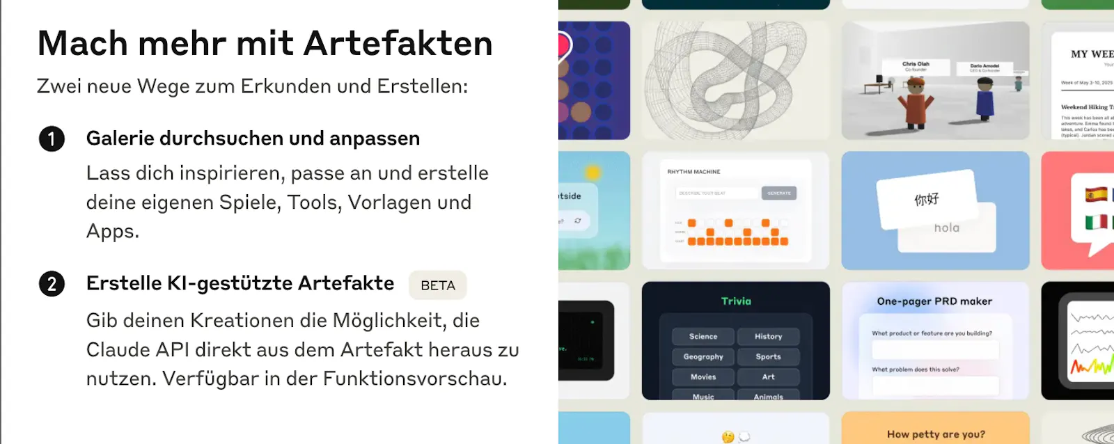 Claude wird zur Entwicklungsplattform: Ab sofort können Nutzer eigene KI-Apps direkt in der Anwendung erstellen und mit der Welt teilen: Von der interaktiven Rhythmusmaschine (Öffnet in neuem Fenster) über Besser als sehr gut (Öffnet in neuem Fenster) oder Geschichten am Himmel (Öffnet in neuem Fenster), um nur einige der teilweise sehr charmanten Apps zu nennen, ist vieles nun möglich.