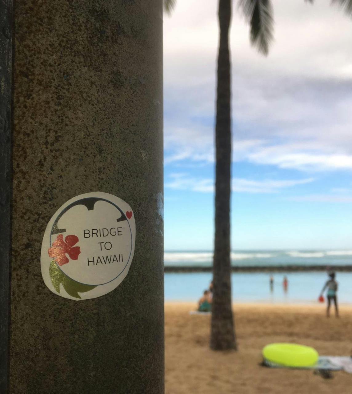 01. Juli 2019 – zwei „Bridge to Hawaii“ Aufkleber schaffen es Dank eines Freundes bis nach Hawaii und werden in Honolulu und am Waikiki Beach aufgeklebt