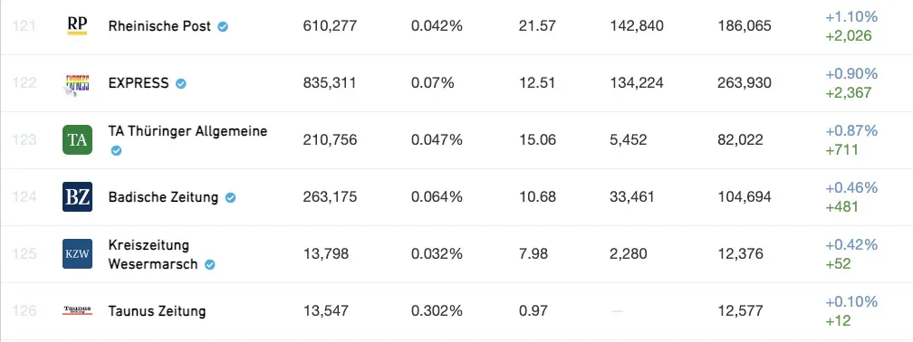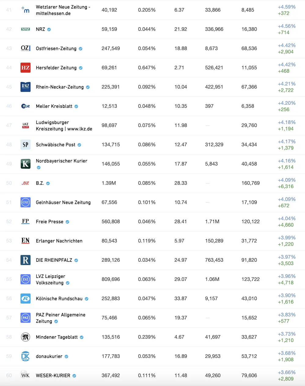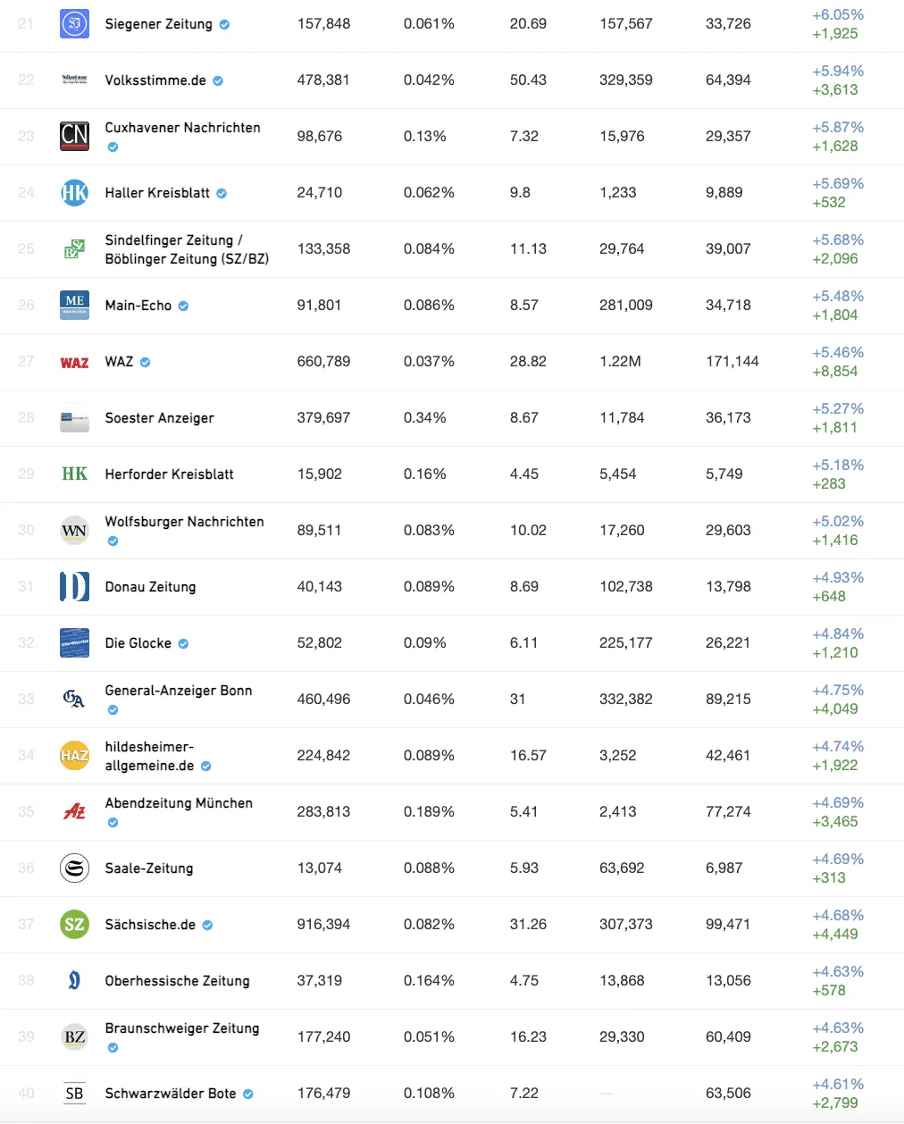 Die Tabelle unten zeigt die Zahlen von 126 deutschen Lokalpublishern im Jahr 2023. Sie ist sortiert nach dem prozentualen Followerwachstum 2023. Die Liste ist also kein Ranking.