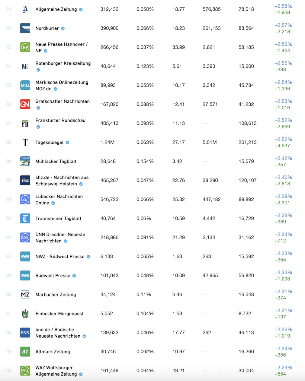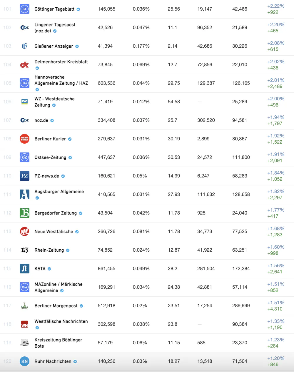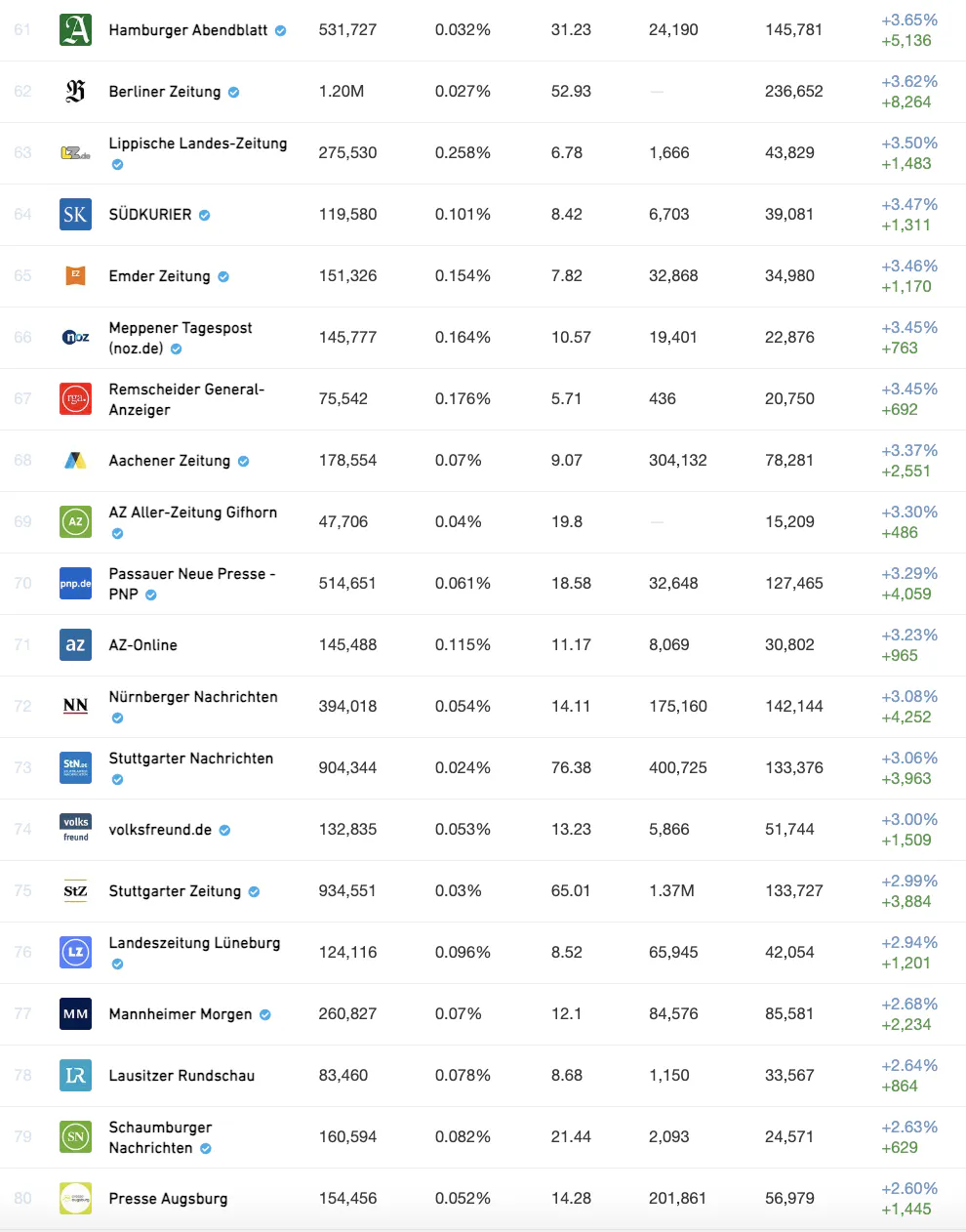 Die Tabelle unten zeigt die Zahlen von 126 deutschen Lokalpublishern im Jahr 2023. Sie ist sortiert nach dem prozentualen Followerwachstum 2023. Die Liste ist also kein Ranking.