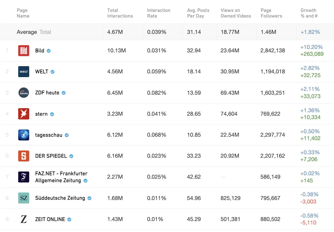 Die Auflistung zeigt die Facebook-Seite mit Interaktionen insgesamt, Anzahl der täglichen Posts, Video-Views und dem absoluten und prozentualem Wachstum.
