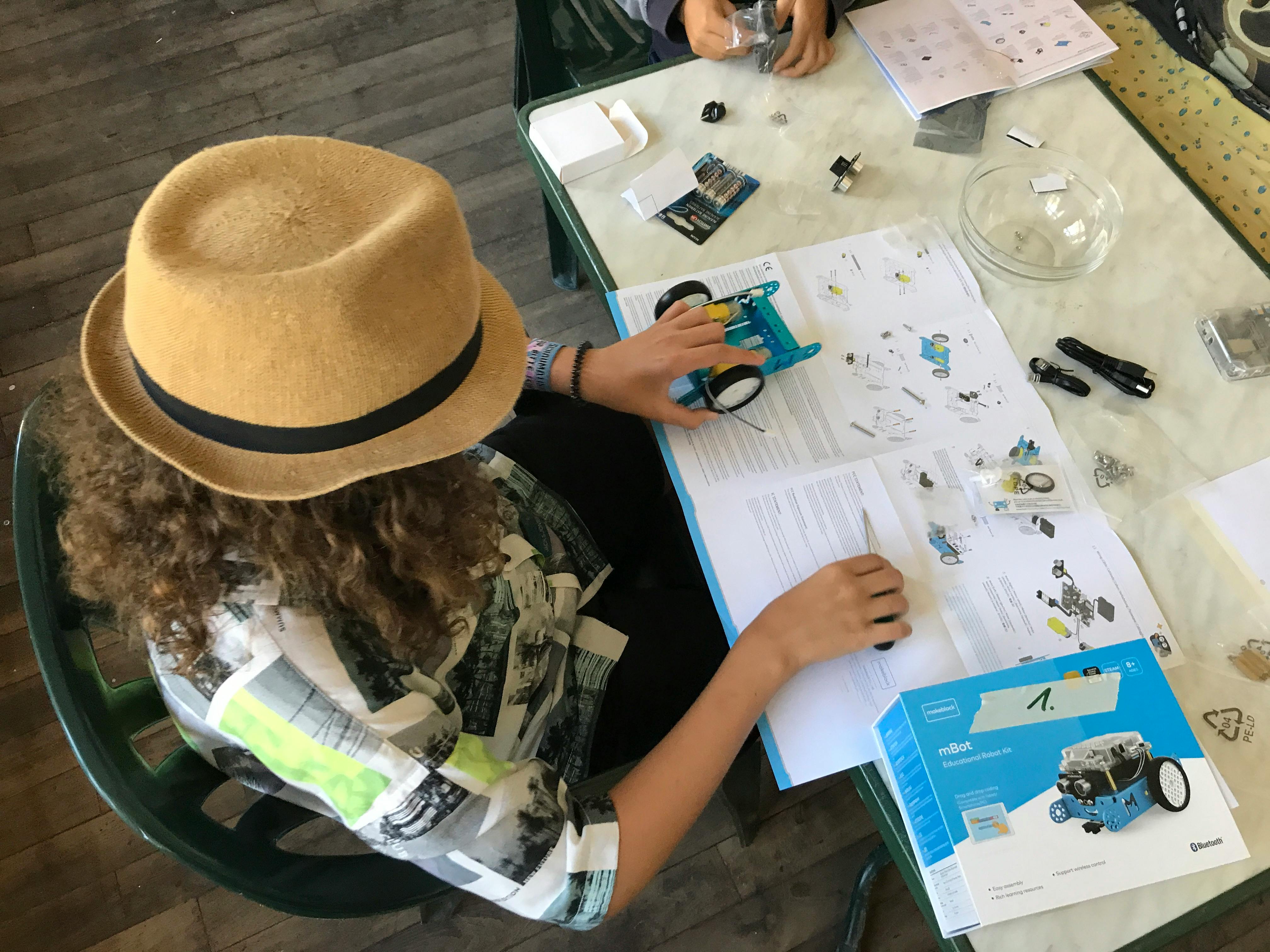 Ganz handfest ging es beim Bau von Mini-Robotern zu, die die drei Mädchen und sieben Jungs im Alter von 10 bis 16 Jahren in Teams ganz individuell bestückten. Und dann ab in die Challenge: einmal mit den Mbots durch einen Hindernis-Parcours fahren auf Zeit. Der entstand übrigens aus Upcycling-Material nach einem spannenden Besuch bei Tabula Grasa (Öffnet in neuem Fenster).