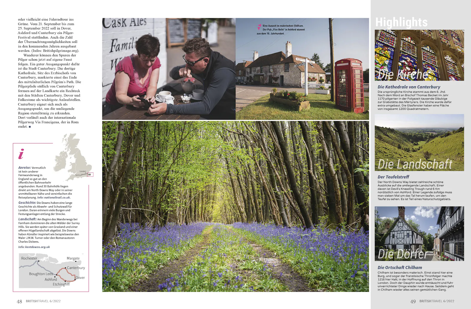 Der Fernwanderweg North Downs Way hat eine Länge von 246 Kilometern und führt durch die Grafschaften Kent und Surrey. Der Weg wurde im Jahr 1978 eingeweiht, doch im Grunde ist er viel älter. Denn er folgt einer Strecke, die Gläubige schon im Mittelalter zurücklegten auf ihrer Reise von Winchester nach Dover, von wo aus sie ihren Weg in Richtung Rom fortsetzten. Der moderne Wanderweg ist in Wahrheit eine alte Pilgerroute.
