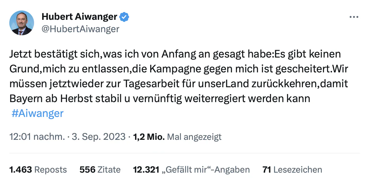 Markus Söder hat Hubert Aiwanger nicht gefeuert, worauf jener postete: