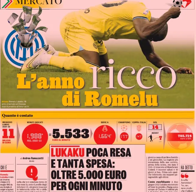 Chi è oggi Romelu Lukaku? Un “affarista”, uno “incapace di piantare radici”, che fa “scelte impopolari che forse fa fatica a giustificare anche a sé stesso”, un calciatore che “spesso ha tradito negli appuntamenti più importanti”. Un “girovago” che si muove “sempre per i suoi affari”, uno il cui naso potrebbe allungarsi come quello di Pinocchio. Uno che chiunque venga intervistato – chiunque – sconsiglia alla Juventus. Cosa sulla quale peraltro personalmente concordo anche in termini di prospettiva (mentre l'instant team ne guadagnerebbe), però non mettere alcuna voce opposta fa abbastanza ridere. Insomma: scarso e – scusate il francesismo – stronzo. Giusto alcuni titoli: