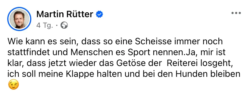 Die Folge beginnt jedoch mit einem echten Aufreger-Moment: Jenny ist wütend. Und zwar über ein Facebook-Posting des bekannten TV-Hundetrainers Martin Rütter. Er hatte ein Video des Gold-Ritts von Vielseitigkeitsreiter Michael Jung bei den Olympischen Spielen in Paris gepostet und dazu geschrieben: "Wie kann es sein, dass so eine Scheisse immer noch stattfindet und Menschen es Sport nennen. Ja, mir ist klar, dass jetzt wieder das Getöse der Reiterei losgeht, ich soll meine Klappe halten und bei den Hunden bleiben." (Bildnachweis: Screenshot Facebook / Martin Rütter).
