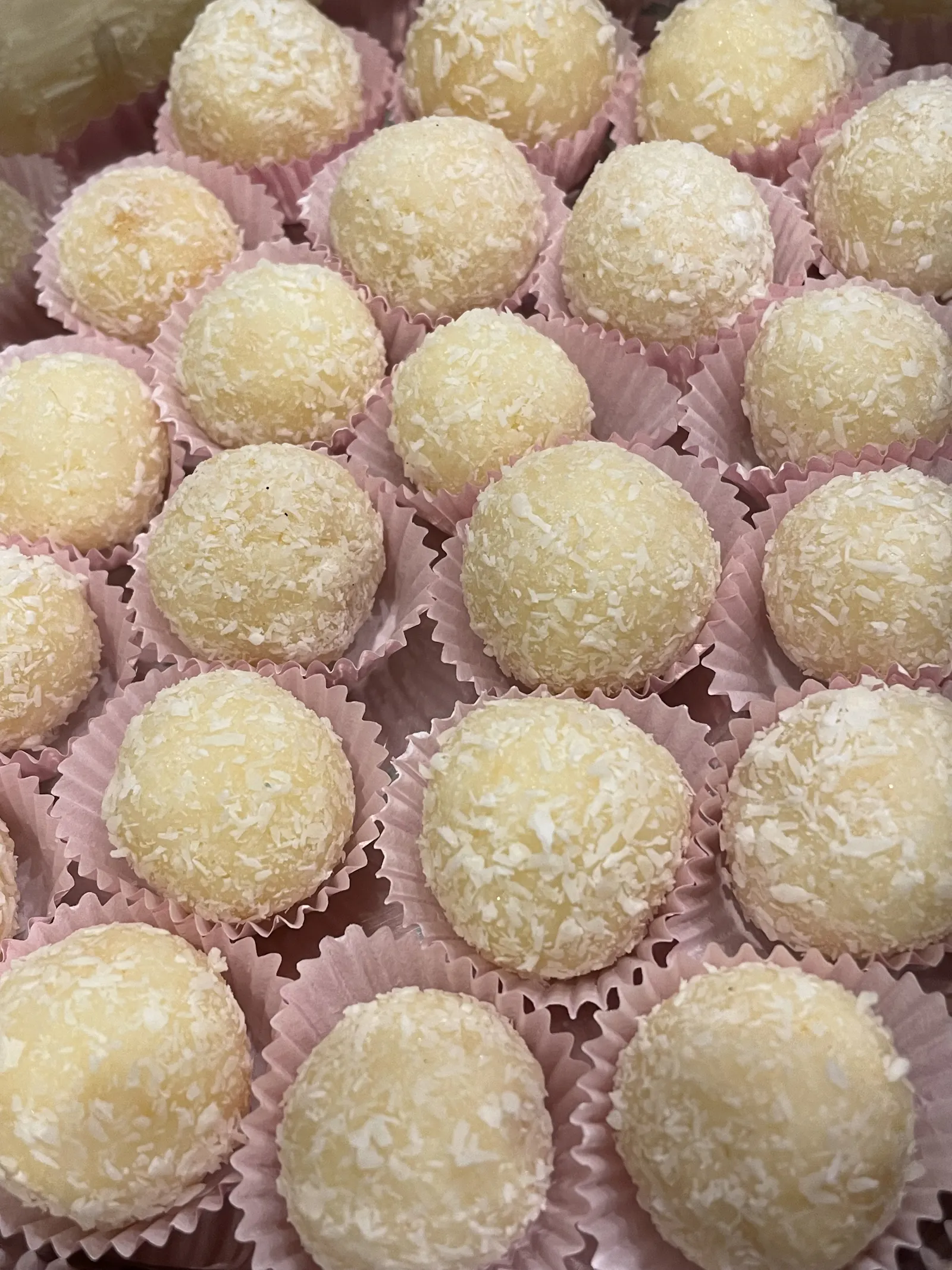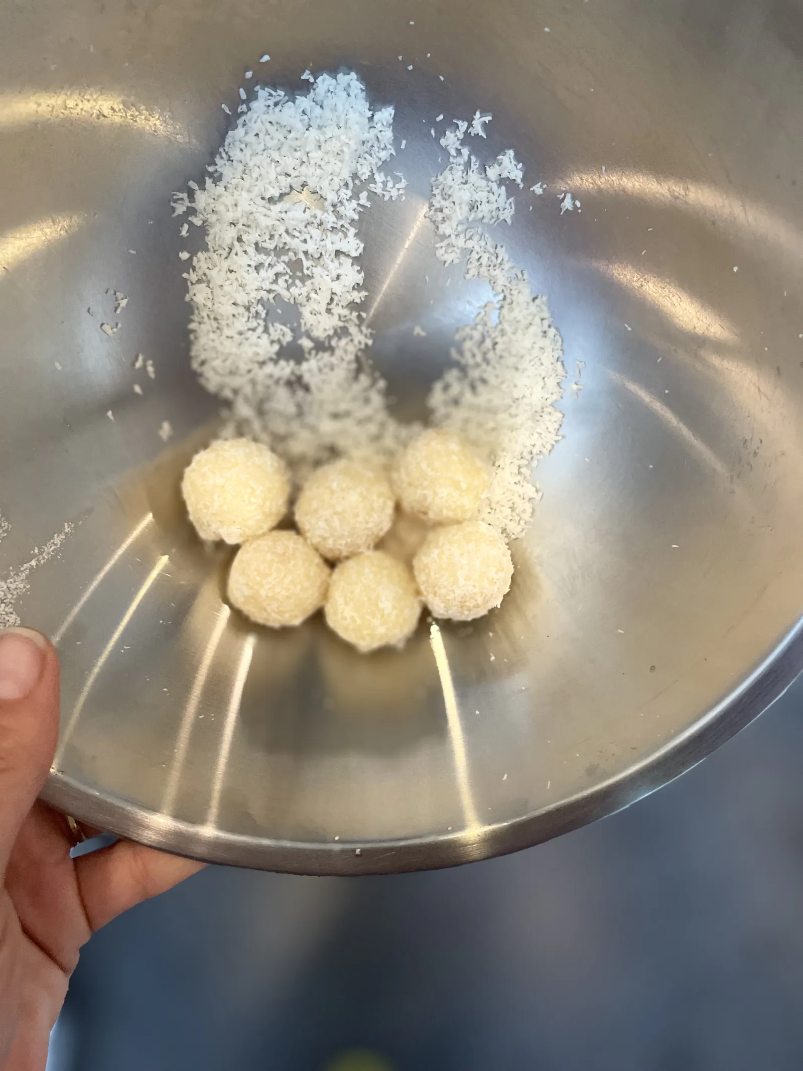 Jetzt hat der Prozess erstmal Pause, denn die Masse sollte vollständig abkühlen. Ist das passiert, formt Ihr aus der erkalteten Masse kleine Kügelchen und schwenkt sie in dem Rest Kokos. Fertig. (Ist der Teig zu klebrig, die Hände etwas Buttern.)