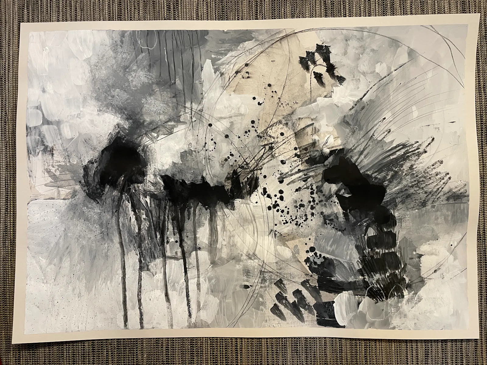 Jippie! Für mich gibt's ja zurzeit kaum etwas Beruhigenderes, als nur mit schwarzer und weißer Farbe und Stiften auf einem Blatt herumzumalen. Ich hab keine Ahnung, warum das gerade so ist. Farbe ist toll. Ich liebe Farbe, aber in der abstrakten Malerei, die ich gerade ausprobiere, überfordert die mich noch.