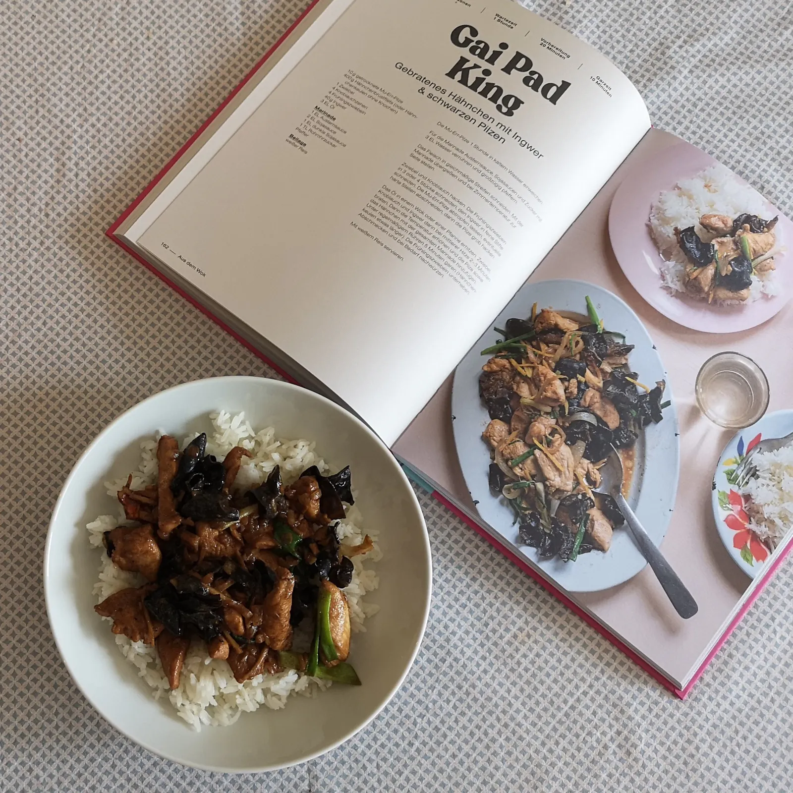 Nachgekocht: u.a. Grünes Curry mit Hähnchen (mit selbstgemachter Currypaste), Tom Yum Khrung (Suppe mit Garnelen & Zitronengras), Gai Pad King (Gebratenes Hähnchen mit Ingwer & schwarzen Pilzen)