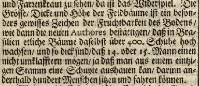 “Die Größe/Dicke und Höhe der Feldbäume ist ein besonders gewisses Zeichen der Fruchtbarkeit des Bodens / wie dann die neuen Autoren bestätigen / dass in Brasilien etliche Bäume daselbst über 400 Schuhe hoch wachsen / und so dick sind / dass 14 oder 15 Mann einen nicht umklaftern mögen / ja dass man aus einem einzigen Stamm eine Schunte ausbauen kann / darin anderthalb hundert Menschen sitzen und fahren können.”