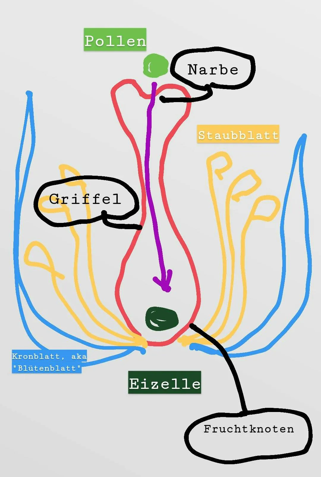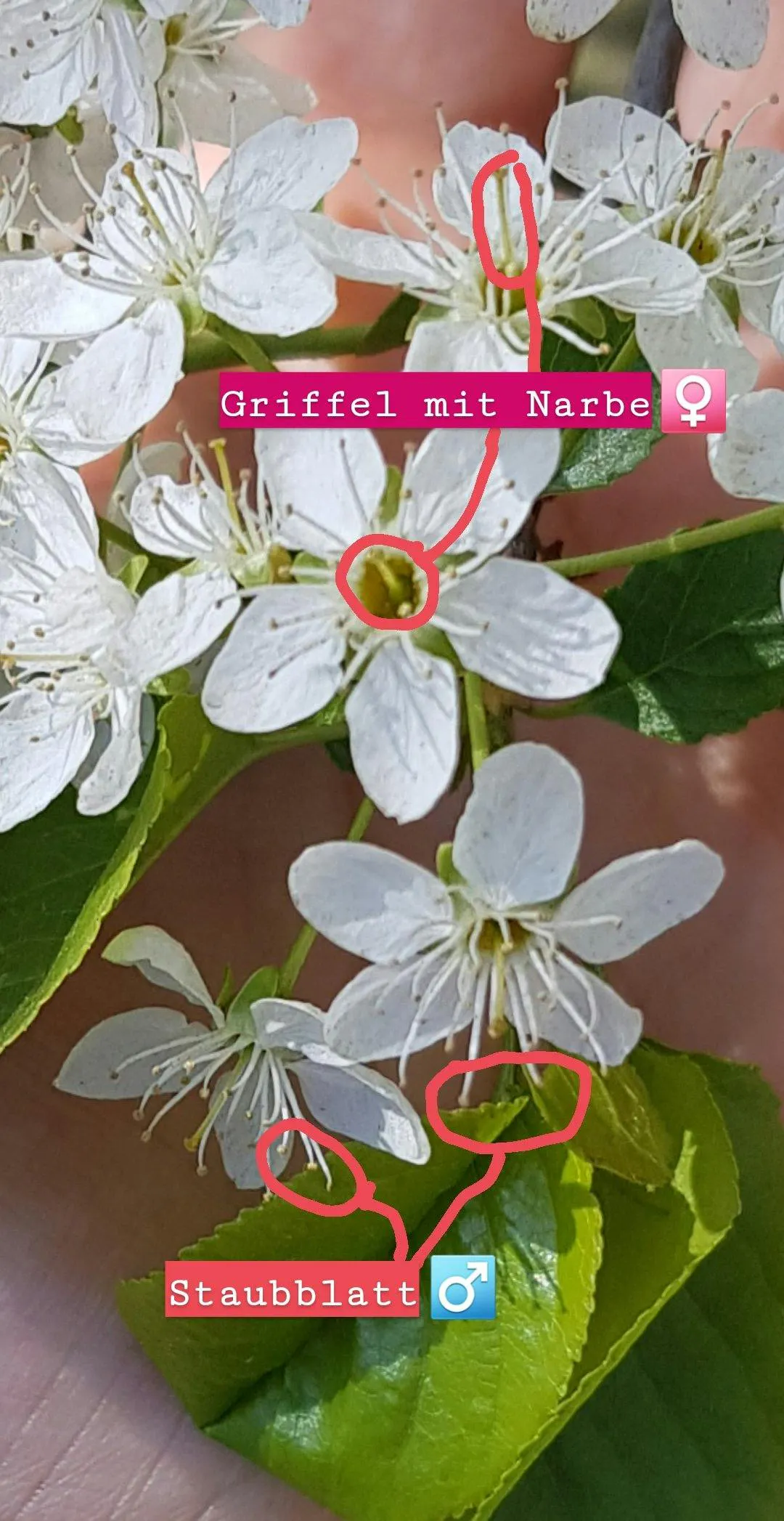 Der Griffel in der Blüte ist hier das weibliche Geschlechtsmerkmal, in ihm sitzt die Eizelle. Die Staubblätter sind männlich und sondern das Sperma ab, das dann als Pollen durch die Luft schwirrt. Hier habe ich das mal eingezeichnet: