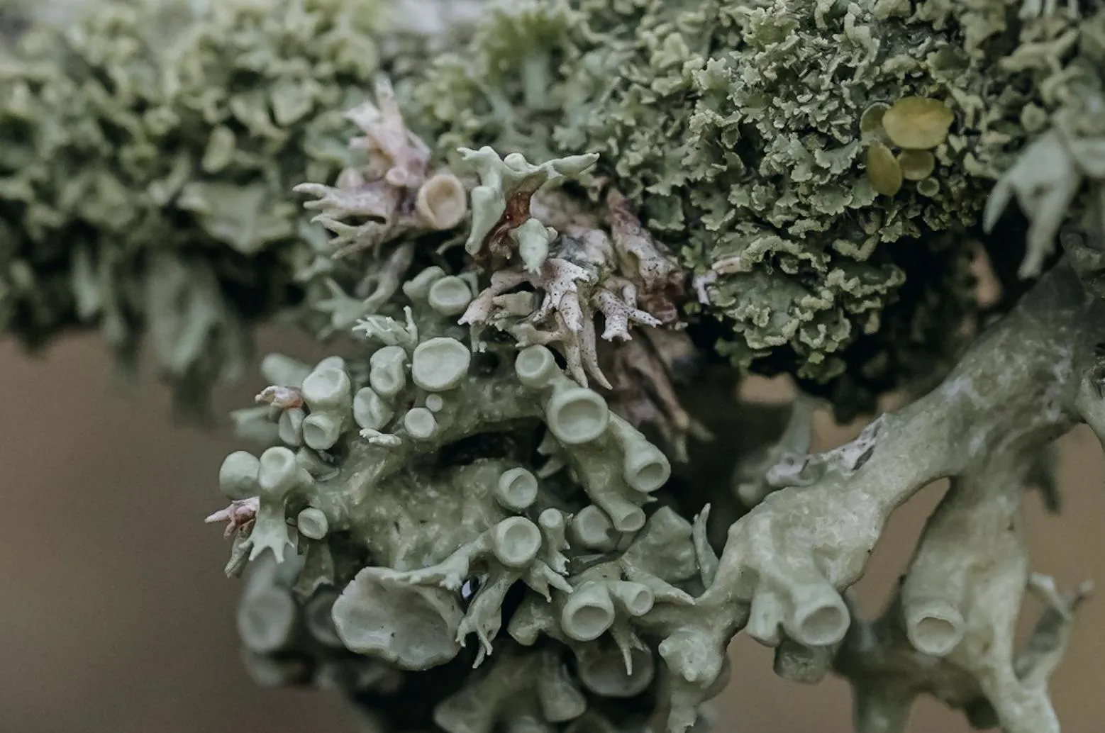 (Auf diesem Foto siehst du verschiedene Flechtenarten auf einem Ast.)