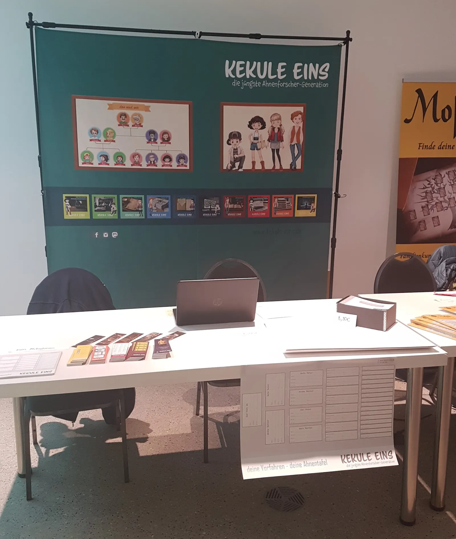 Am vergangenen Wochenende fand im Dokumentationszentrum Flucht, Vertreibung, Versöhnung in Berlin der 74. Deutsche Genealogentag statt, wo ich das Projekt Kekule Eins vorgestellt habe. Von Freitag bis Sonntag haben sich zahlreiche Interessenten am Stand über das Projekt informiert und sich mit einer Ahnentafel in Heft (Öffnet in neuem Fenster)- oder Posterform (Öffnet in neuem Fenster) eingedeckt. Einige der Besucher kannten das Projekt bereits und folgen schon den Seiten auf Instagram, Facebook oder Mastodon. Andere nutzten die Chance, sich einmal die Kekule-Nummerierung erklären zu lassen (auf die das Projekt natürlich keine Ansprüche stellt, auch wenn der Projekt-Name kein Zufall ist).