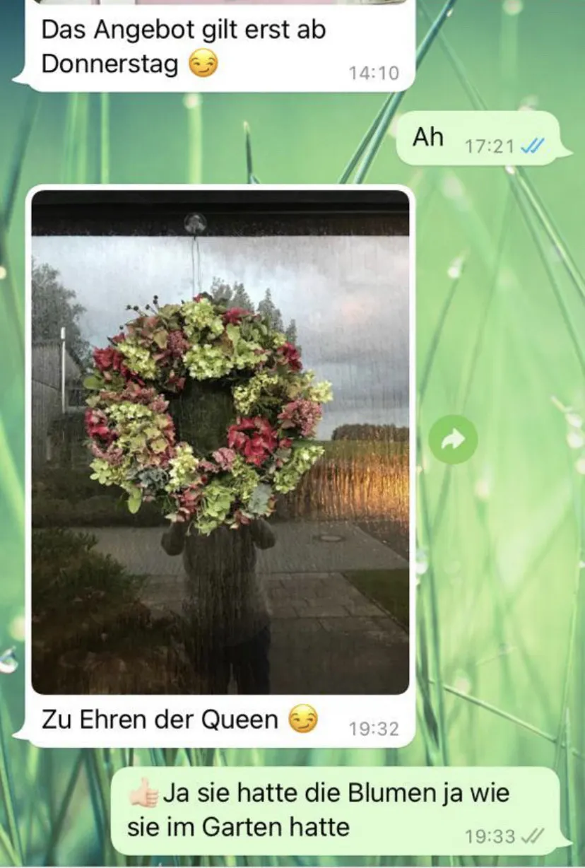 (Chat zwischen Peters Mutter und seiner Tante. (c) Ex-Schwiegermutter "Liebe Grüße aus A. Judith. Und drücke Jonas herzlich von uns.")