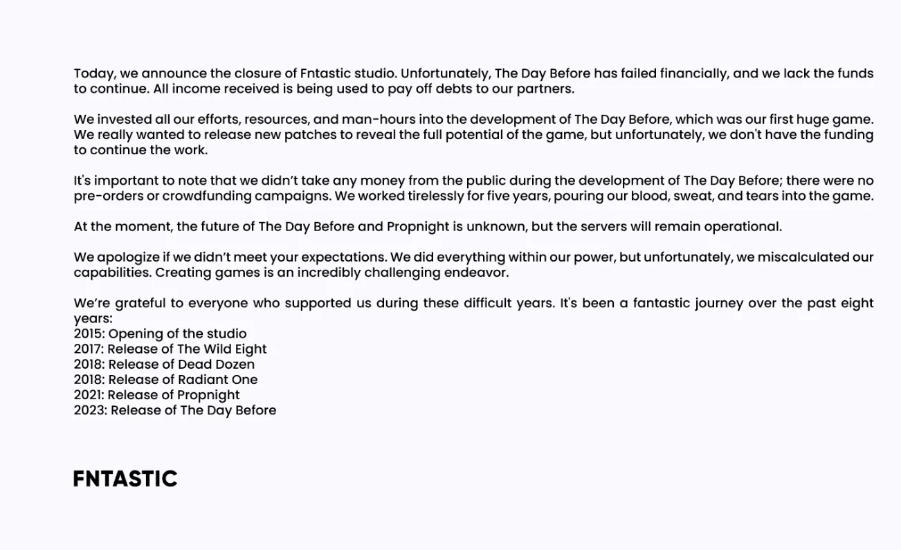 Das großangekündigte Spiel The Day Before war für alle ein ganz klares Ding: Entweder der nächste große Titel, oder ein riesen Scam. Letztere sollten Recht behalten. Nach einem desaströsem Start, mit mächtig Problemen und einenm zusammengebauten Spiel aus Assets, wurde nach nur 4 Tagen das Entwicklerstudio geschlossen, das Spiel von Steam genommen, und der Chef des Ganzen hat wohl mittlerweile alle Online-Präsenzen von sich selbst gelöscht. Wer das offizielle Statement zum Entwicklerstudio lesen möchte, findet das hier: Tweet von Fntastic (Öffnet in neuem Fenster) | Wer sich für Seitenhiebe interessiert: DayZ hat “zufälligerweise” auf die eigene 10 jährige Erfolgsgeschichte zurückgeblickt: Tweet von DayZ (Öffnet in neuem Fenster)