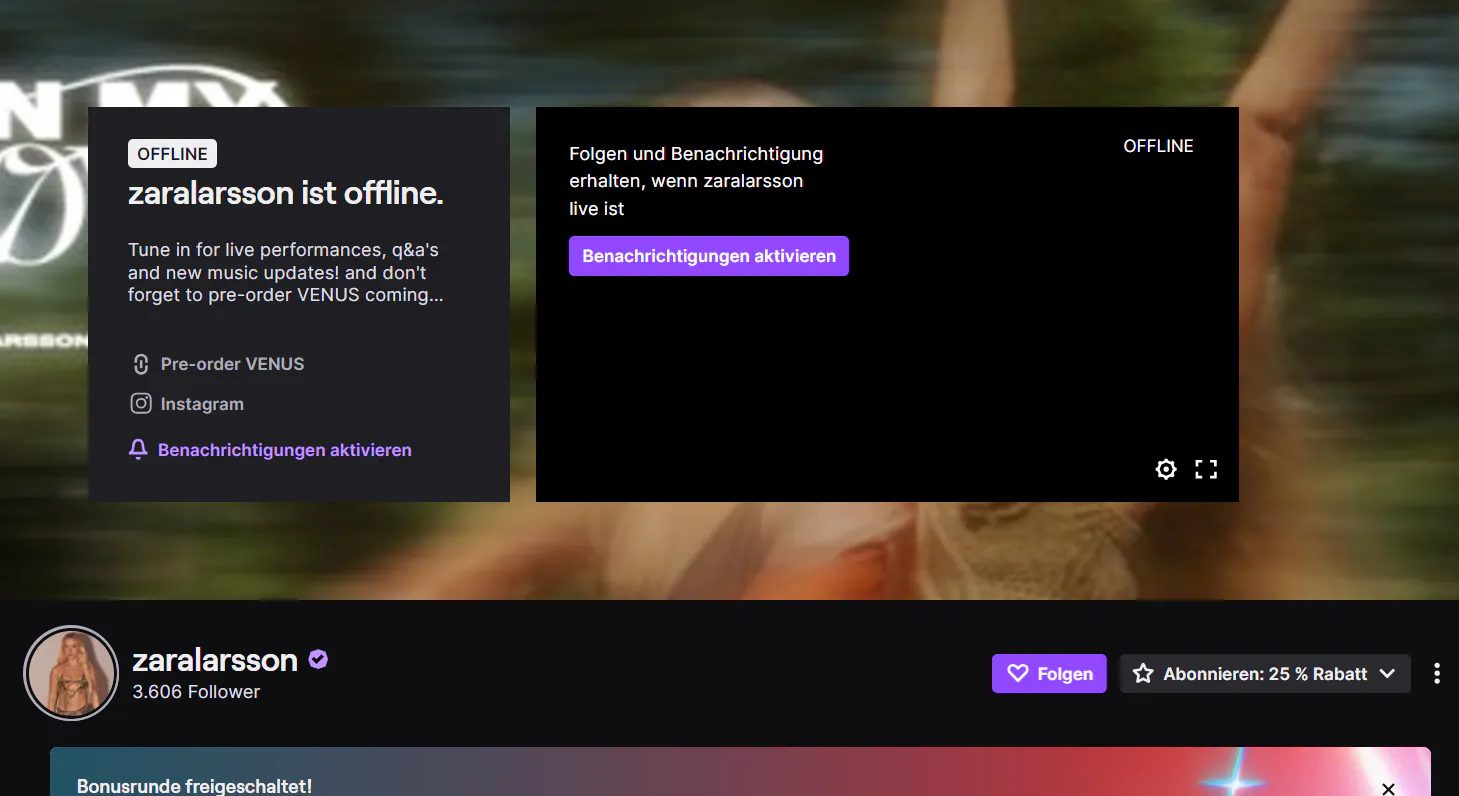 Gerüchte besagen, dass Sängerin Zara Larsson eine Partnerschaft mit Twitch eingegangen ist, um dort mit ausgewählten Partner:innen Weihnachtslieder zu singen und zu streamen. Ihr Twitch Account ttv/ZaraLarsson (Öffnet in neuem Fenster) hat den Partnerhaken und offiziell auch einen Stream eingetragen, allerdings gibt es kein VOD dazu.