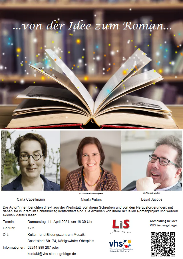 für den März hatten wir Ihnen zwei interessante Veranstaltungen angekündigt, die beide sehr erfolgreich gelaufen sind. Am 14.03.2024 setzten wir in Zusammenarbeit mit der VHS Siebengebirge die neue Veranstaltungsre (Öffnet in neuem Fenster)ihe „Lesungen in den Ateliers des Siebengebirges“ fort. Unsere Autorin Michaela Küpper war zu Gast bei der Malerin Ingrid Klein im Kulturforum Palastweiher in Königswinter. Exklusiv für die Besucher gab es eine Atelierführung vorab.