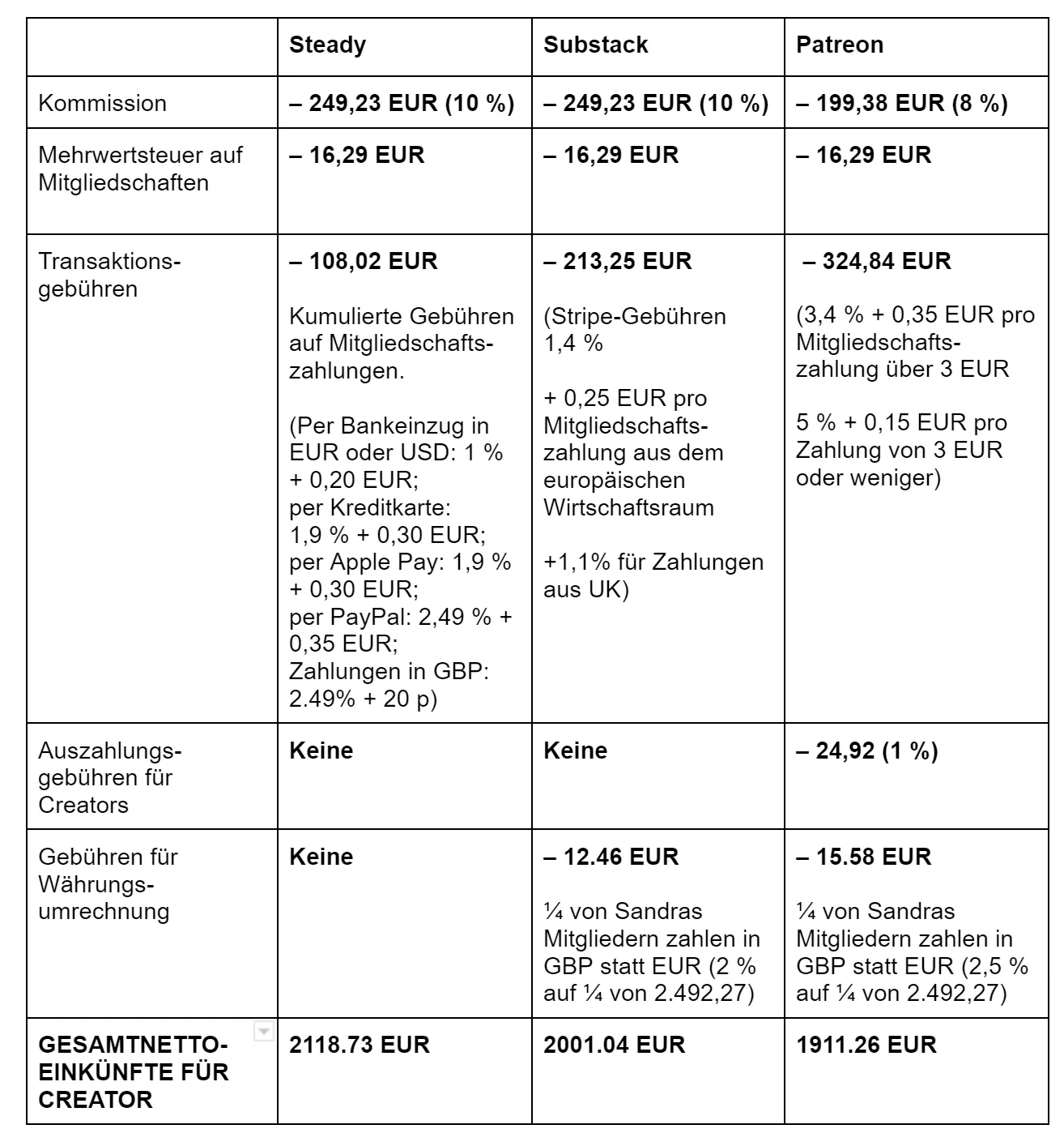 Monatlich würde sie so mehr als 110 EUR mehr verdienen als mit Substack und mehr als 200 EUR mehr als mit Patreon.