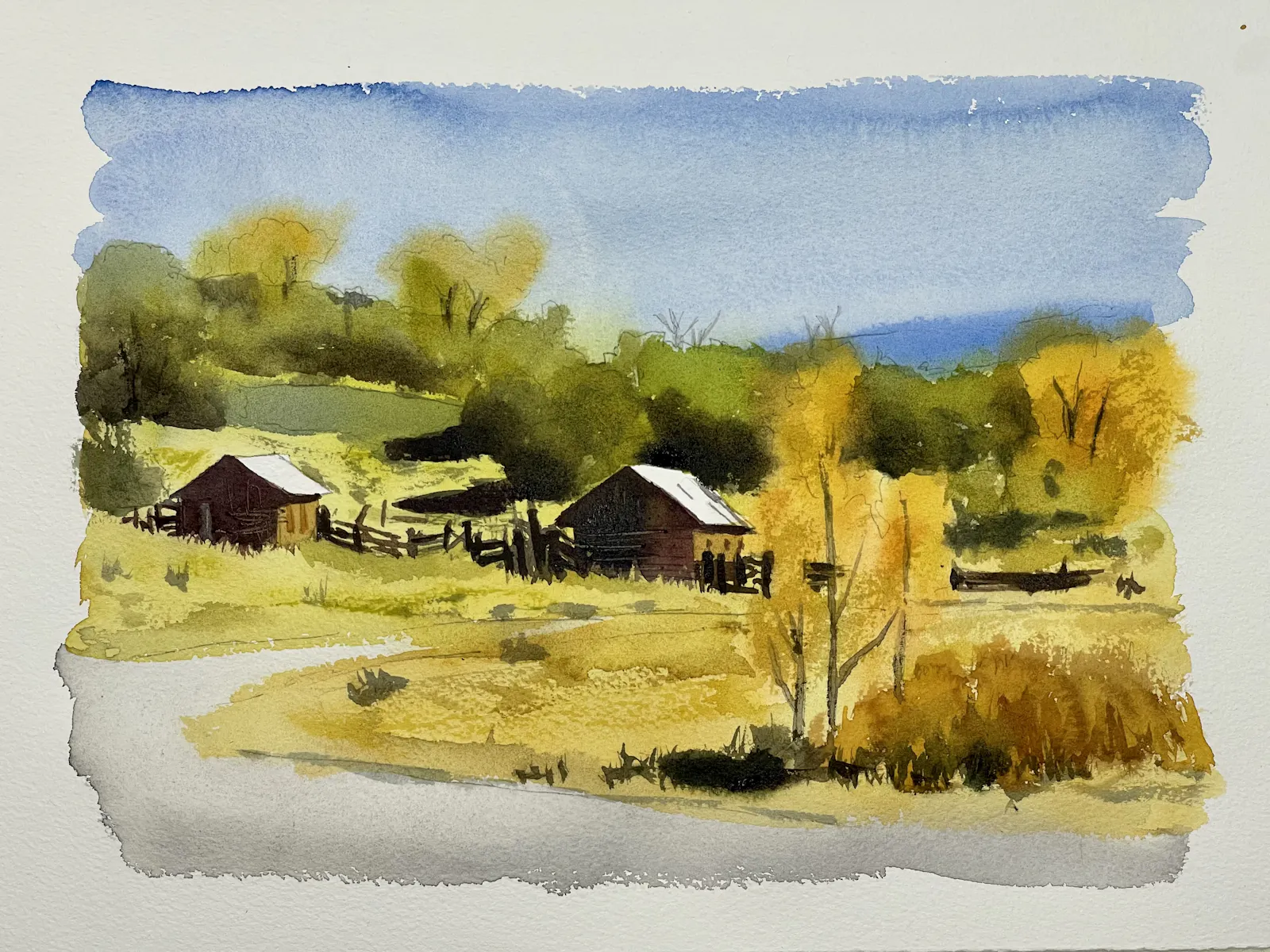 Hi zusammen, heute habe ich das Foto zum YouTube Video „Two barns“ und das Aquarell desselben Motivs, das ich in einem Workshop gemalt hatte.