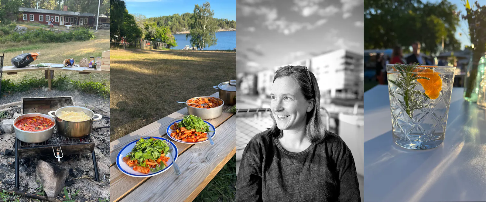 Nudeln mit Sauce, zubereitet auf einem Grill, auf einer Insel im Schärengarten in Schweden. Überhaupt, Sommer in Schweden!