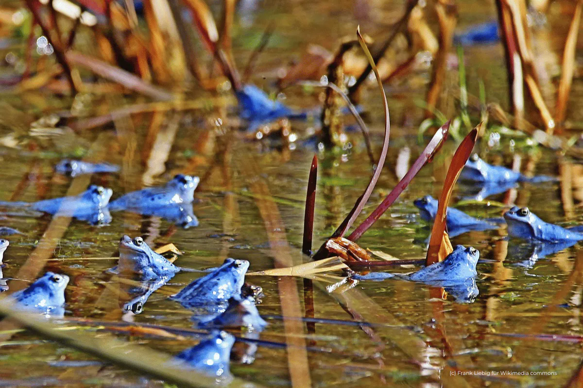Hast du schon einmal blaue Frösche gesehen? Der Moorfrosch ist eine kleine Froschart, die in Mooren und Sümpfen lebt. Zur Paarungszeit im Frühjahr färben sich die Männchen leuchtend blau , um die Weibchen zu beeindrucken.