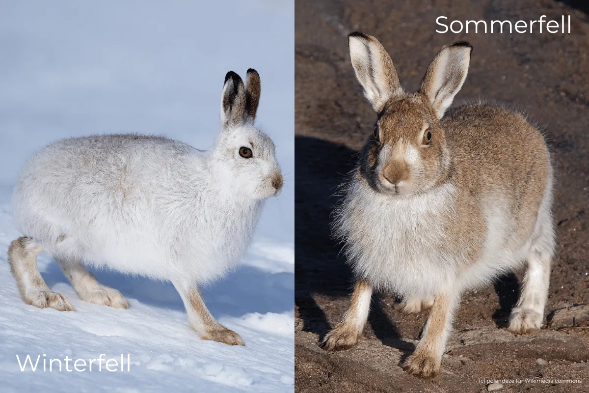 Der Alpenschneehase ist ein echter Überlebenskünstler! Im Sommer hat er braunes Fell, das ihn in den Felsen tarnt, und im Winter wird es schneeweiß, damit er im Schnee unsichtbar wird.