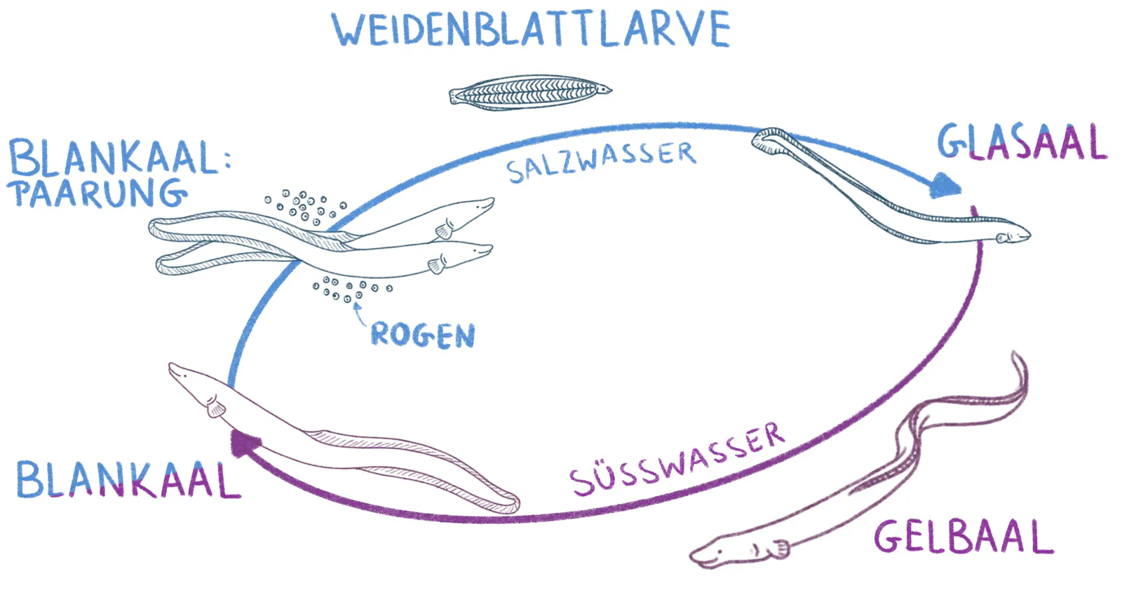 Die kleinen Larven schlüpfen dort und treiben mit dem Golfstrom zurück nach Europa. Hier wachsen sie in Flüssen und Seen auf, bis sie nach vielen Jahren wieder den weiten Weg zurück zur Sargassosee antreten.