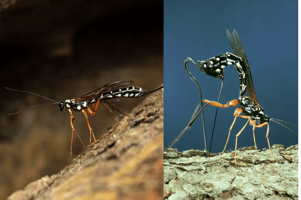 Die Holzwespen-Schlupfwespe ist ein cooles Insekt! Die Weibchen haben einen suuuuper langen Legebohrer, mit dem sie durch Holz bohren, um ihre Eier direkt auf die Larven von Holzwespen zu legen. Aber keine Sorge, stechen können sie uns mit dem Bohrer nicht!