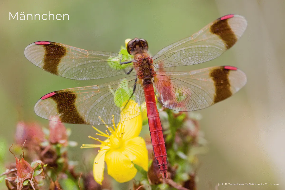 Die Gebänderte Heidelibelle ist eine auffällige Libelle mit besonderen Flügeln: Sie hat braune Bänder darauf. Sie lebt gerne in Tälern und an Flüssen, vor allem im Nordwesten Deutschlands, am Oberrhein und im Alpenvorland.