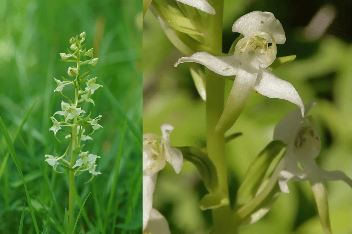 Die Grünliche Waldhyazinthe ist eine hübsche, etwas unauffällige Orchidee, die in lichten Wäldern und auf Feuchtwiesen wächst. Ihre Blüten sind weiß oder grünlich-weiß und duften in der Dämmerung. Damit lockt sie Nachtfalter an, die die Pflanze bestäuben.