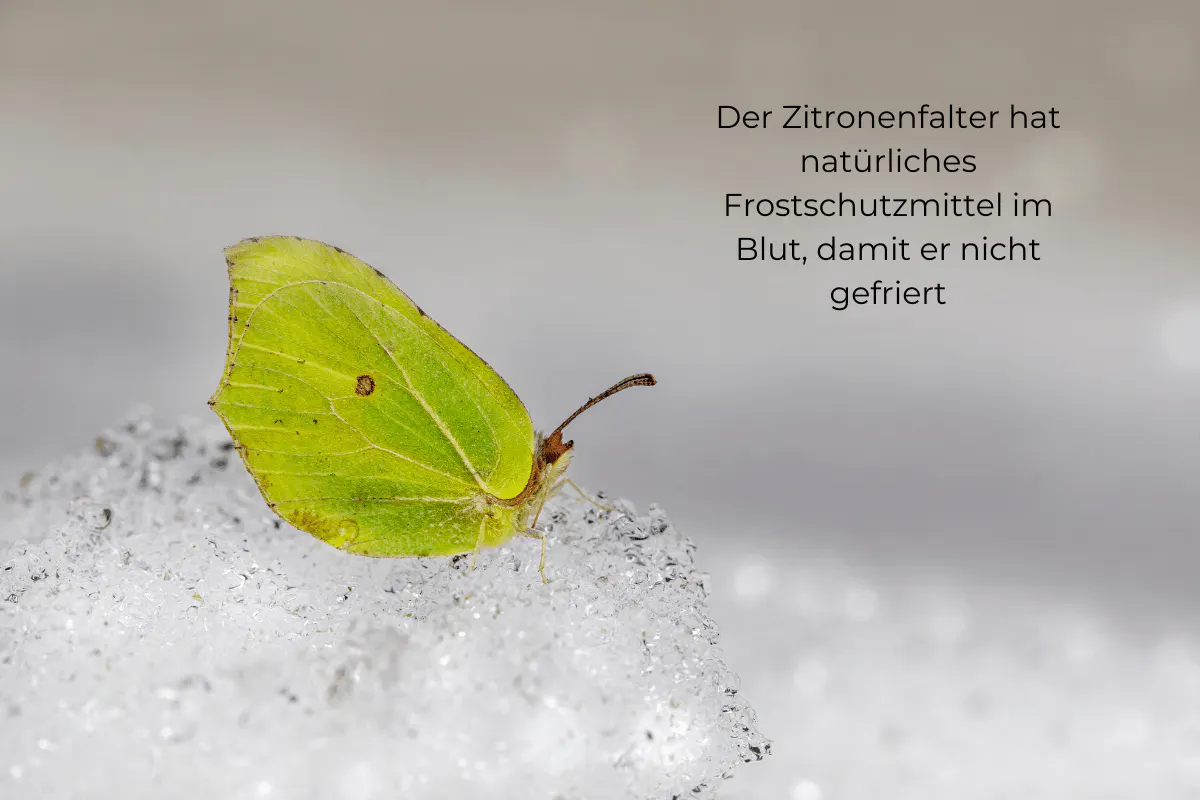 Wusstest du, dass du auch im Winter Insekten und andere kleine Tiere beobachten kannst? Ich habe schon einmal im Winter einen Zitronenfalter entdeckt. Im Gegensatz zu anderen Schmetterlingen zieht er sich nicht ins Warme zurück. Er überwintert einfach, indem er sich in einem Busch an ein Blatt oder einen Zweig hängt.