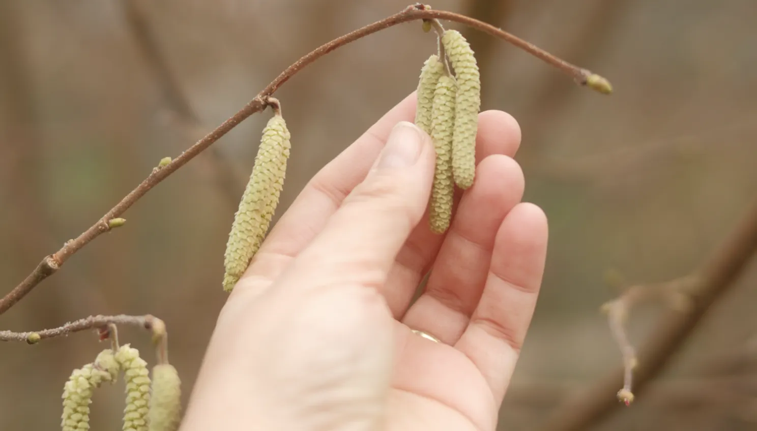 Erlen- und Haselblüten streuen ihren Pollen in die Luft – Allergikerinnen und Allergiker bekommen jetzt wieder eine Schniefnase. Hier habe ich die männlichen Blüten einer Hasel in der Hand: