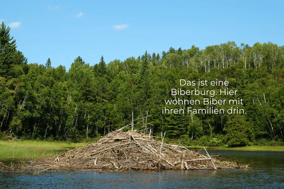 Biber leben in Familiengruppen in einer sogenannten “Biberburg”. Das sieht aus wie ein Stapel Holz, der auf dem Wasser schwimmt.