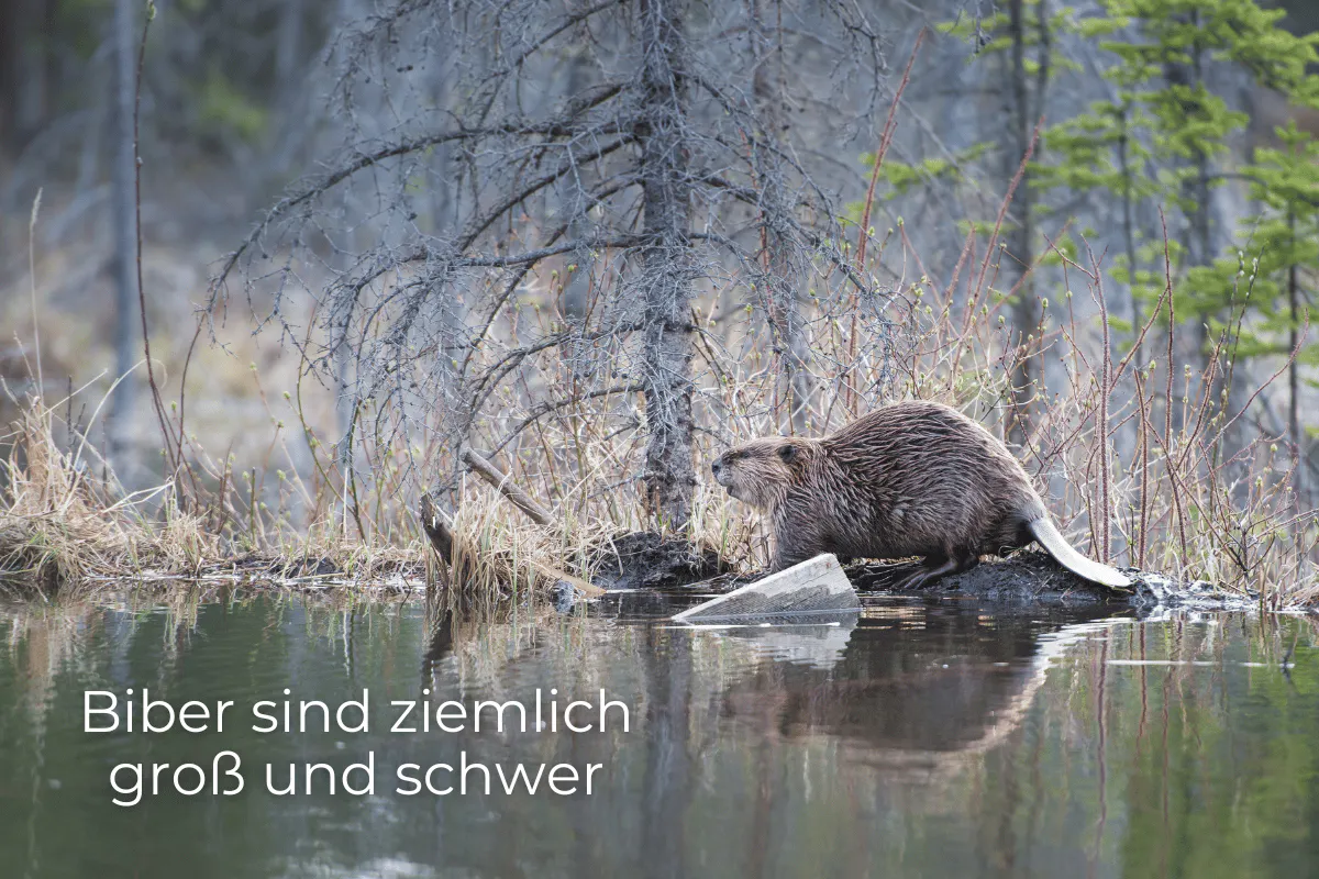 Der Biber ist das größte Nagetier Europas. Er fällt sofort durch seinen kräftigen Körper auf. Erwachsene Tiere können über einen Meter lang werden und bis zu 30 Kilo wiegen! Am auffälligsten sind sein flacher, breiter Schwanz und seine orangen Schneidezähne. Sein Schwanz sieht aus wie ein Paddel. Damit kann er im Wasser gut steuern und auch Geräusche machen. Sein dichtes braunes Fell ist wasserabweisend und hält ihn warm. Seine Augen sind durch eine dünne Haut geschützt, sodass er wie mit einer Taucherbrille unter Wasser sehen kann.