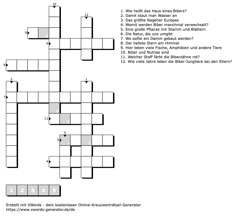 In diesem Suchsel sind ebenfalls Worte versteckt, die mit dem Leben eines Bibers zu tun haben. Kannst du alle finden? Die Worte sind waagerecht und senkrecht versteckt, also von links nach rechts und von oben nach unten! Hier findest du ein PDF zum Ausdrucken» (Öffnet in neuem Fenster), das auch die Lösung parat hat. Aber versuch es erstmal selbst: