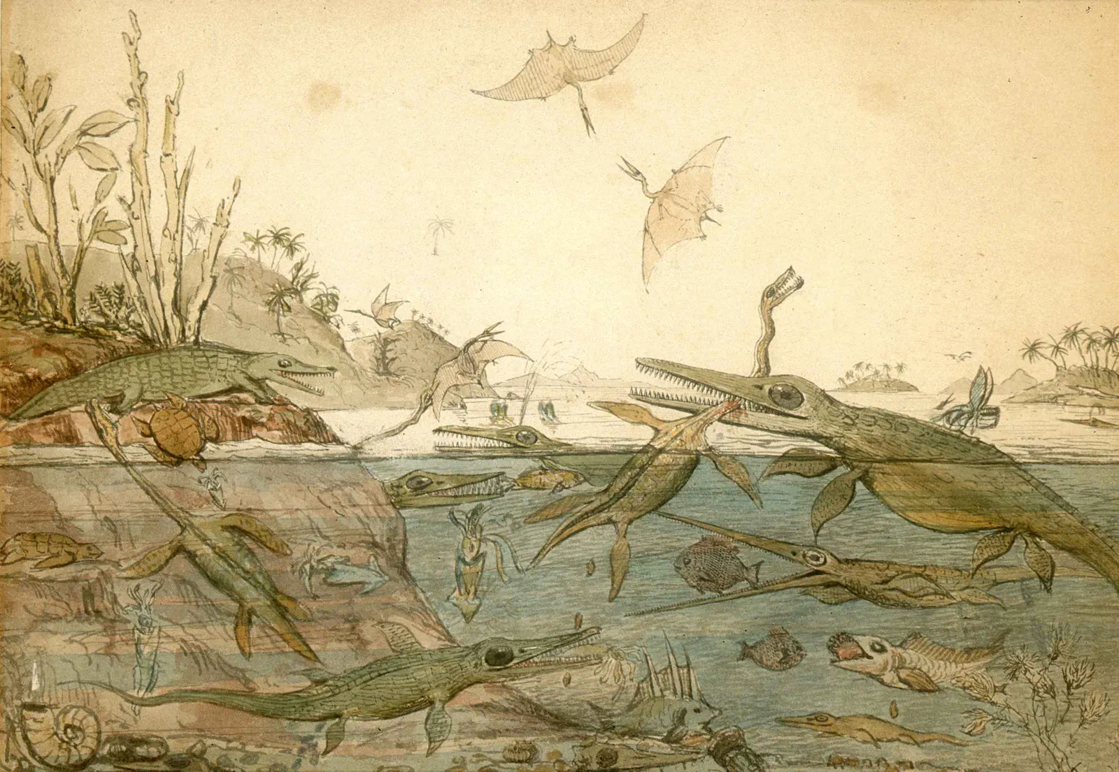 Das Gemälde heißt “Duria Antiquior” und wurde vom Geologen Henry De La Beche gemalt. Es zeigt, wie er sich die Fossilienfunde von Mary Anning als lebende Tiere vorgestellt hat. 1830.