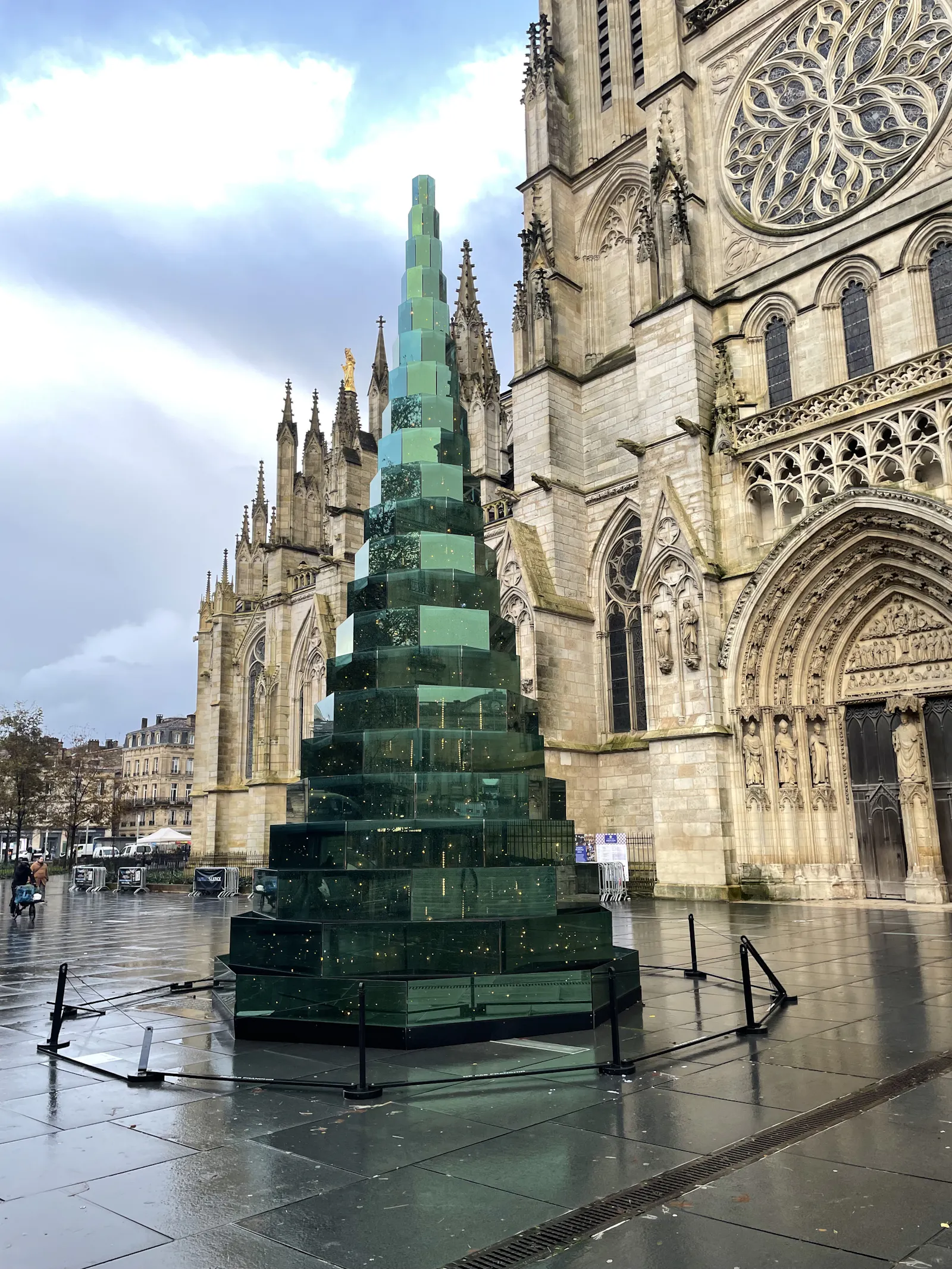 Vor dem Rathaus und der Kathedrale der schönen Stadt Bordeaux steht in diesem Jahr erstmalig eine Weihnachtsbaumskulptur, ganz aus Glas und Metall. Sie ist ein Politikum ersten Ranges.