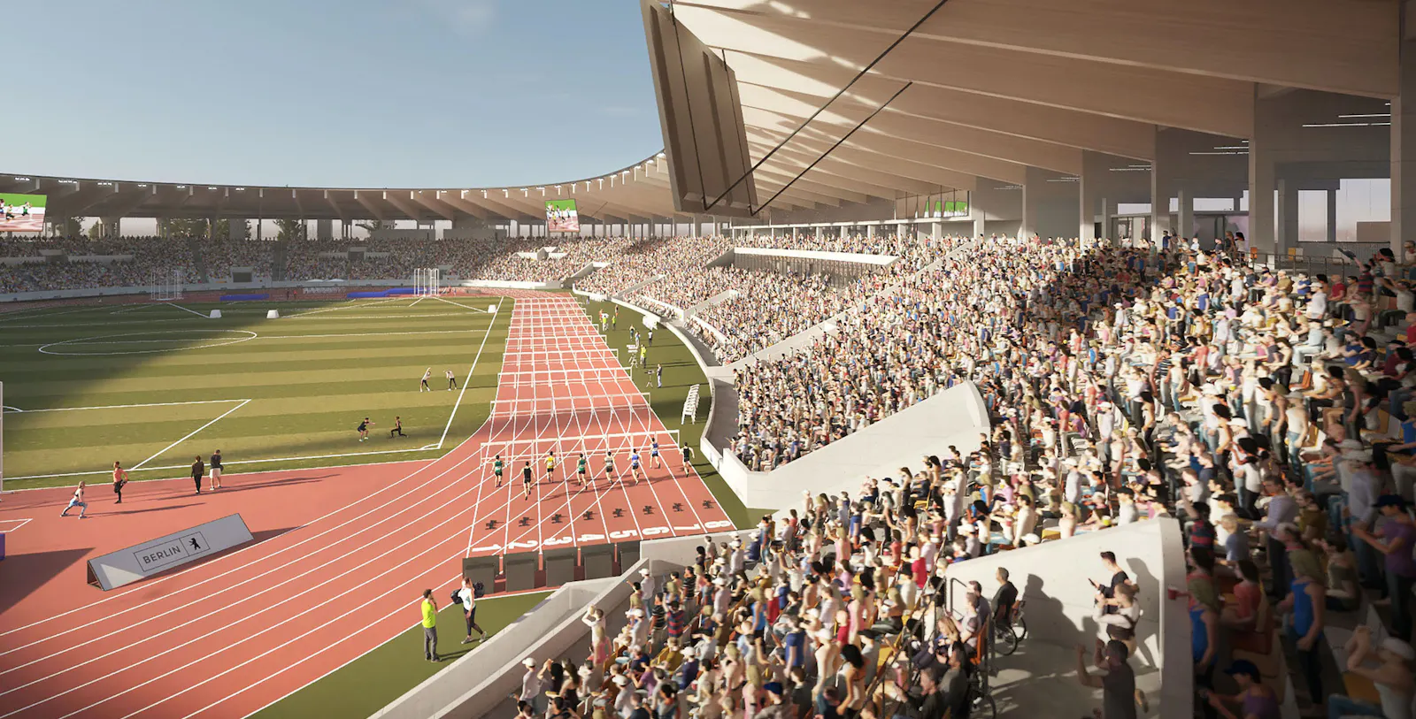 Ein modernes Stadion für 20.000 Besucher:innen, insgesamt sechs Fußballfelder, fünf Tennisplätze, vier Beachvolleyballfelder, ein Hockeyfeld. Dazu eine mehrgeschossige Multifunktionssporthalle, ein sechsstöckiges Besucherzentrum, ein Haus der Fußballkulturen und ein Begegnungszentrum. Das sind die Pläne für den neuen, barrierefreien Jahn-Sportpark, die die Senatsverwaltung für Stadtentwicklung und Sport nun vorgestellt hat. Das alte Stadion soll nach dem Sommer abgerissen, der Neubau bis 2027 fertiggestellt werden (mehr (Öffnet in neuem Fenster)).