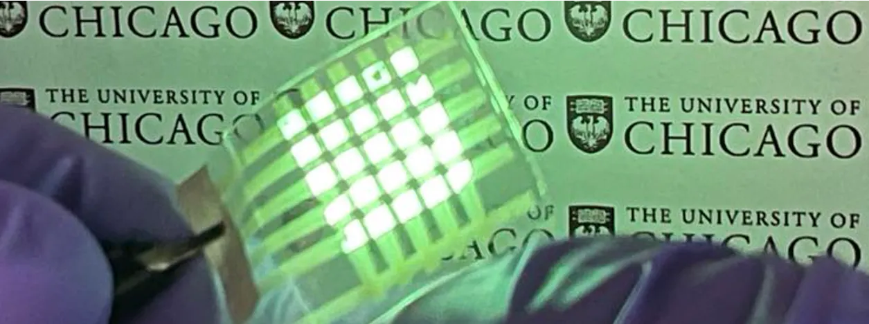 Elastisch dehnbare, flexibel formbare Displays sind seit langem ein Traum von Designer*innen, denn die Anwendungsmöglichkeiten scheinen grenzenlos: von aufrollbaren Bildschirmen bis zu Displays, die sich an frei geformte Produktoberflächen oder als Wearable an den Körper anschmiegen. Jetzt gelang einem Team an der Pritzker School of Molecular Engineering (PME) der University of Chicago ein Durchbruch dank neuen OLED-Materialien. Ihr Display-Prototyp kann auf mehr als das Doppelte seiner Länge gedehnt werden, behält dabei Lichtemission und ein klares Bild bei. Da sie auf der Elektro-Lumineszenz von Polymeren basieren, waren OLEDs die vielversprechenden Kandidaten für flexible Displays. Allerdings waren sie bisher eher steif und spröde.