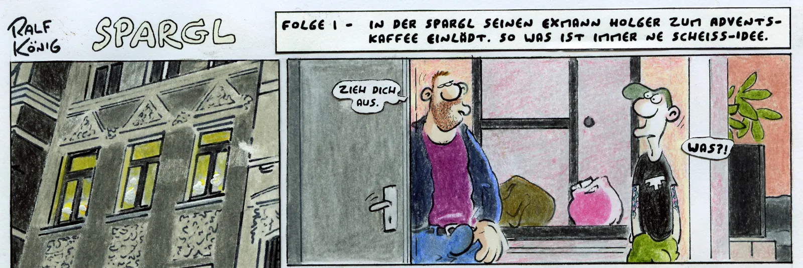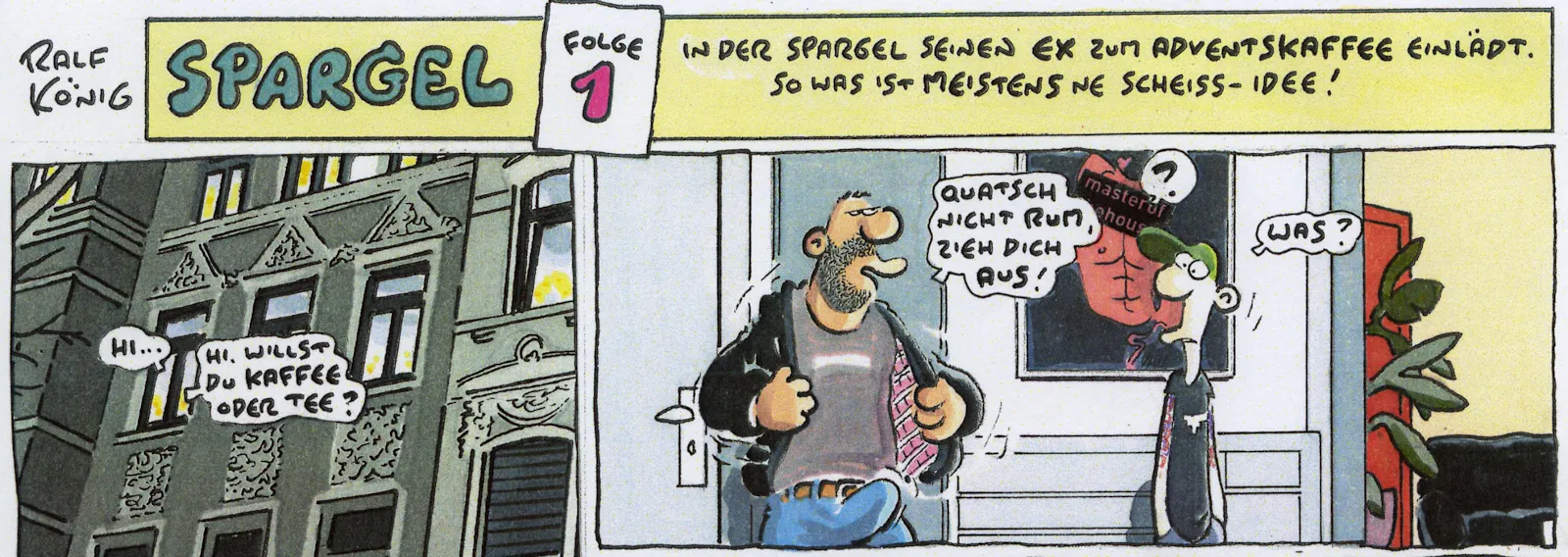 'Spargel' war ursprünglich eine Comicfigur, die ich zunächst für das schwule Berliner Pornomagazin 'BONER' zeichnete. Dass es das überhaupt noch gab, ein Hardcore-Magazin aus Papier, das für umsonst in den Szeneläden rumlag und sich durch Anzeigen finanzierte, war cool. Ich fühlte mich undergroundig schmuddelig und genoss es, für ein klares Zielpublikum deftige Kost zu kochen. Leider kam dann Corona über die Welt und die Bars und Läden blieben leer, die Anzeigenkunden aus und nachdem man noch aus Sparsamkeitsgründen für ein paar Ausgaben das Format von A4 auf A5 änderte, (was für den Comic natürlich ungut war, falls es mal eine Buchveröffentlichung geben sollte) ging das Blatt dann in die Insolvenz.