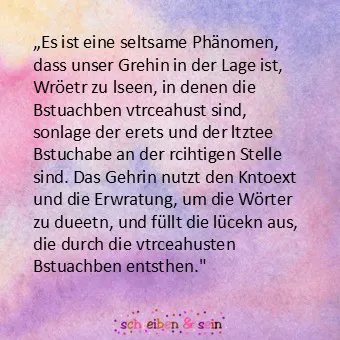 "Es ist eine seltsame Phänomen, dass unser Gehirn in der Lage ist, Wröetr zu lseen, in denen die Bstuachben vtrceahust sind, solange der erets und der ltztee Bstuchabe an der rcihtigen Stelle sind. Das Gehirn nutzt den Kntoext und die Erwratung, um die Wörter zu dueetn, und füllt die lücekn aus, die durch die vtrceahusten Bstuachben entsthen."