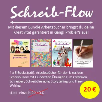 4 x E-Books (pdf): Arbeitsbücher für den kreativen Schreib-Flow mit Hunderten Übungen zum kreativen Schreiben, Schreibtherapie, Storytelling und Free-Writing.
