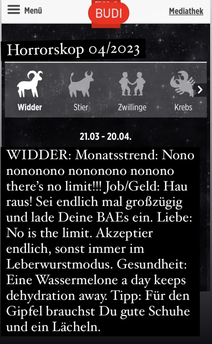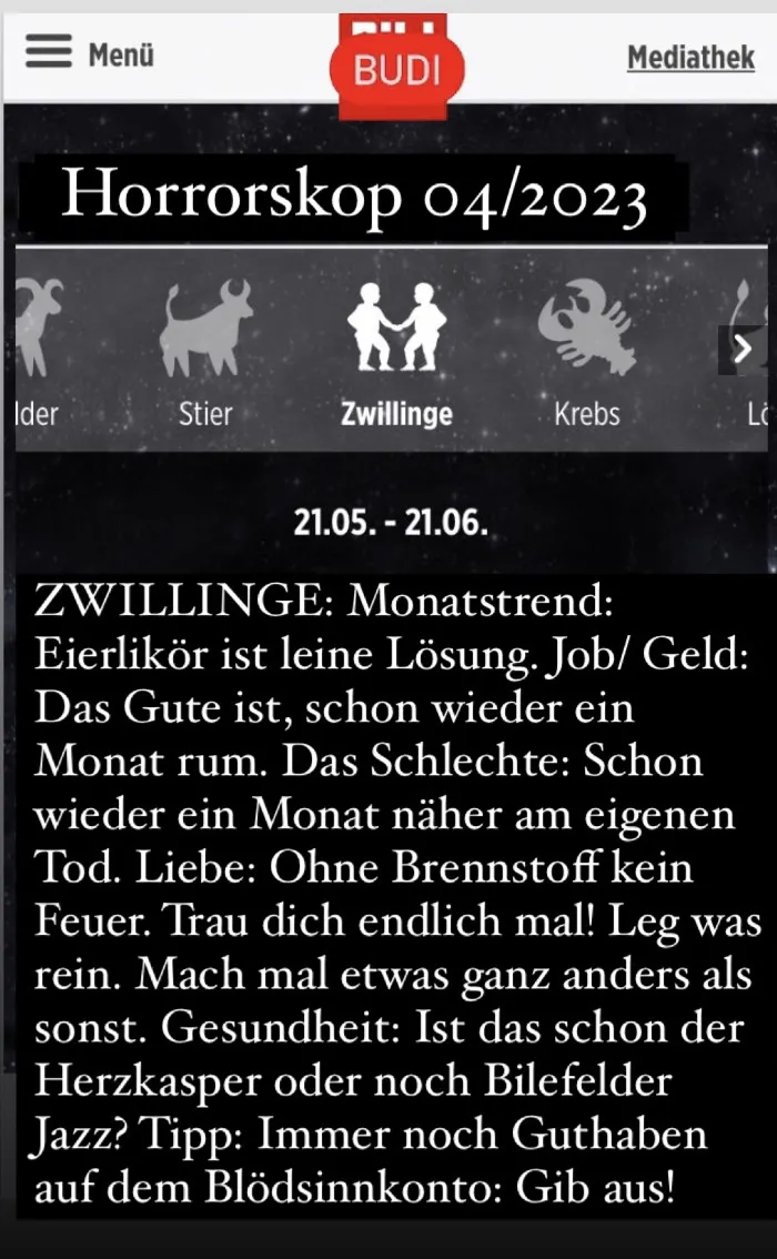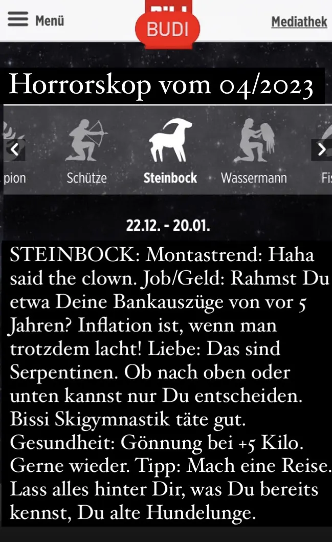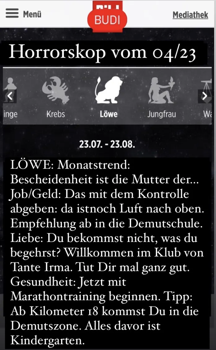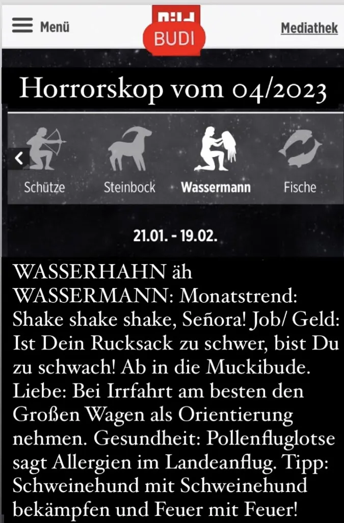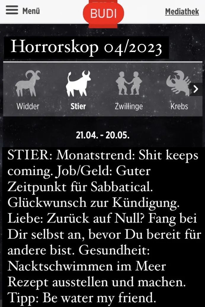 Gönn Dir Muckibudes Tierkreiszeichen-Horror schon mit dem kleinsten Paket! Garantierte Zwerchfellentsapnnung. Erleuchtung inklusive.