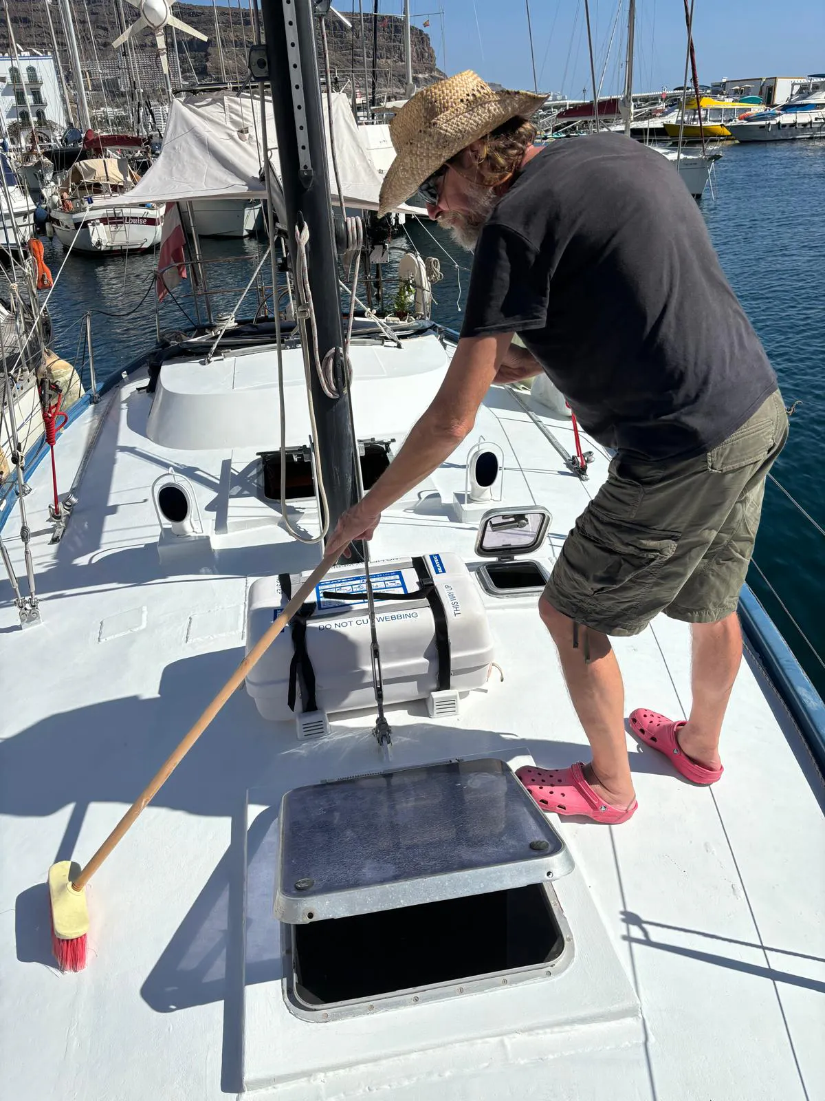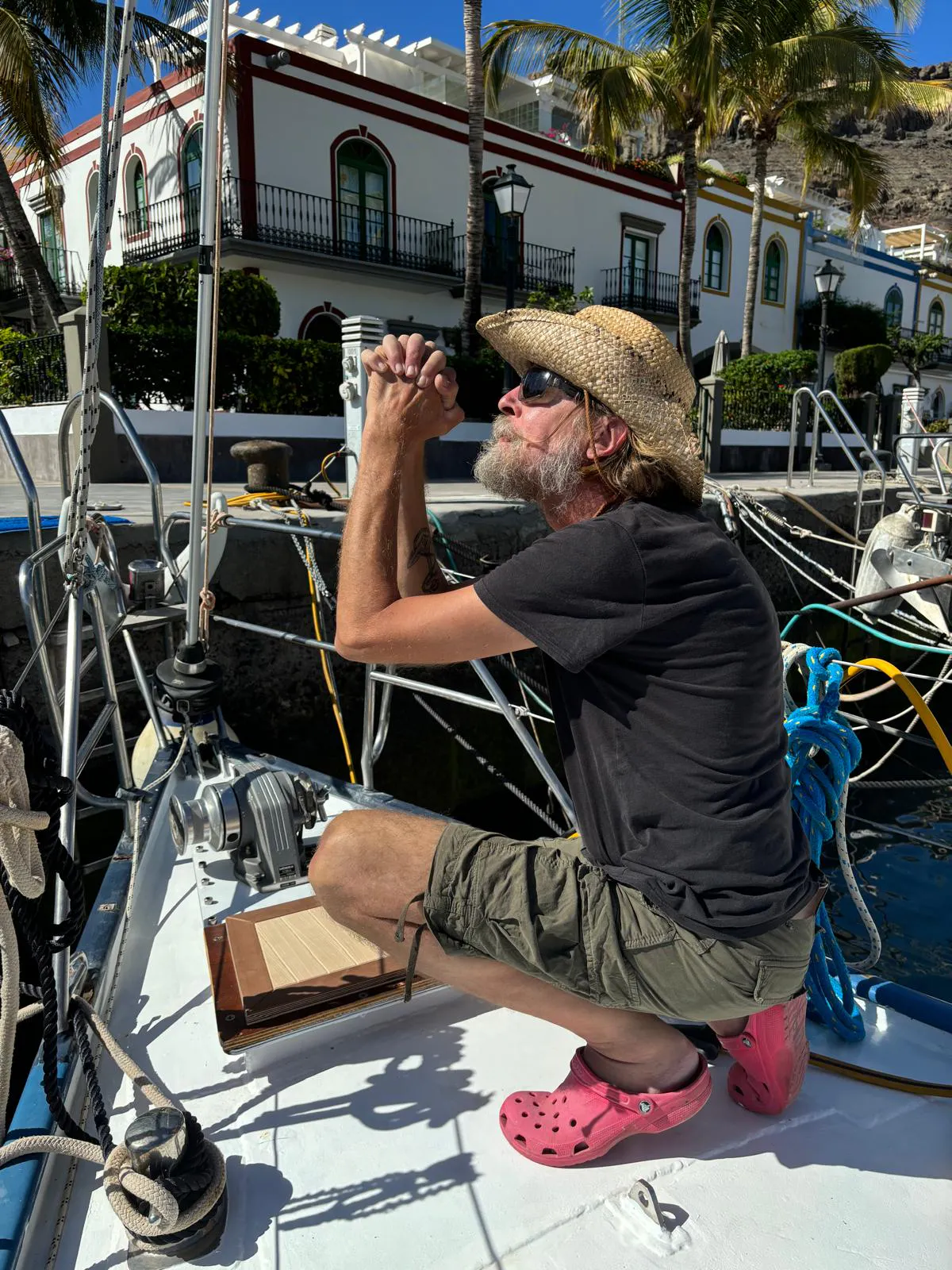 Was macht man, wenn man zur Yacht kommt und die Leiter fehlt? Tja, dann ist Kreativität gefragt. Und ja, Bootsfriedensbruch ist natürlich auch mit im Spiel. Die Steuerfrau ist nämlich zurück auf Gran Canaria und sendet live auf Puerto de Mogan.