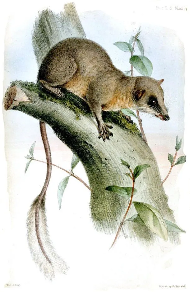Quelle: Das Spitzhörnchen Ptilocercus lowii. Joseph Wolf (1820–1899), Proceedings of the Zoological Society of London, 1848, Mamm. pl. 2)