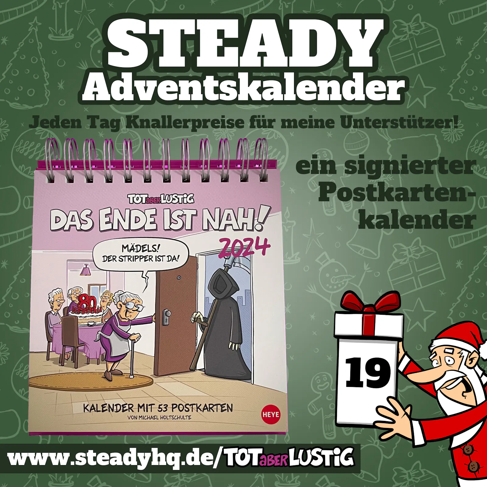Heute gibt noch einmal den Tot, aber lustig - Postkartenkalender (https://amzn.to/41t4vHC (Öffnet in neuem Fenster)) für 2024 zu gewinnen. Natürlich signiert und mit kleiner Zeichnung versehen.