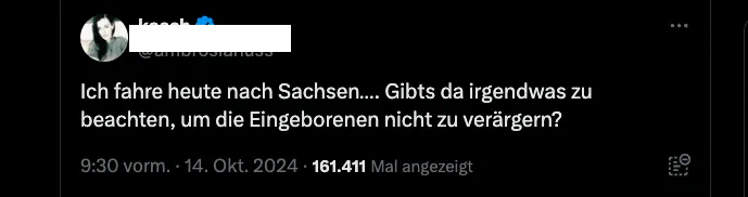 Vor Wochen teilte eine Rechtsanwältin aus Nordrhein-Westfalen dem Rest der Welt mit, sie fahre heute nach Sachsen. Außerdem fragte sie auf der früher Twitter genannten Plattform X (Öffnet in neuem Fenster) – mutmaßlich augenzwinkernd: „Gibt es da irgendwas zu beachten, um die Eingeborenen nicht zu verärgern?“