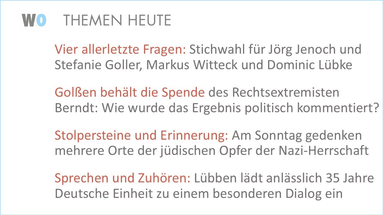 Allerletzte Fragen habe ich auch den vier Kandidierenden für die Stichwahl ums Bürgermeisteramt am Sonntag in Eichwalde und Schulzendorf gestellt. Markus Witteck (CDU, Schulzendorf) hat auf unsere Anfrage nicht reagiert.