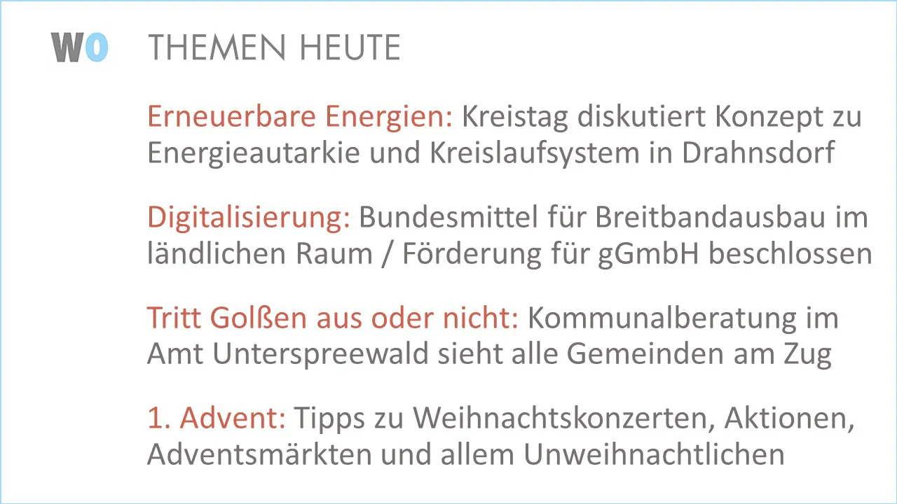 Die Idee ist nicht neu, aber bestechend: Die Gemeinde Drahnsdorf möchte ein energieautarkes Kreislaufsystem in ihrer Gemeinde entwickeln mit einer regionalen, autarken Energieversorgung und mit “intelligentem Stromnetz”, das die Speicherung, Versorgung und Steuerung von Strom aus erneuerbaren Energiequellen regelt. Dem Vorbild der Gemeinde Feldheim (Öffnet in neuem Fenster) (Ortsteil von Treuenbrietzen) folgend, soll mit Bürgern, Unternehmen und Kommune ein genossenschaftlicher Betrieb gegründet werden, der Miteigentümer des Stromnetzes ist. Somit könnte der Strom in der Gemeinde preiswerter werden - ein, wenn nicht das wichtigste Argument für eine breite Akzeptanz erneuerbarer Energien. “Hier ließe sich in der Praxis mal zeigen, was wir können als Landkreis: Wir zeigen, was geht”, warb Lutz Franzke (SPD) im Kreisentwicklungsausschuss um Zustimmung.