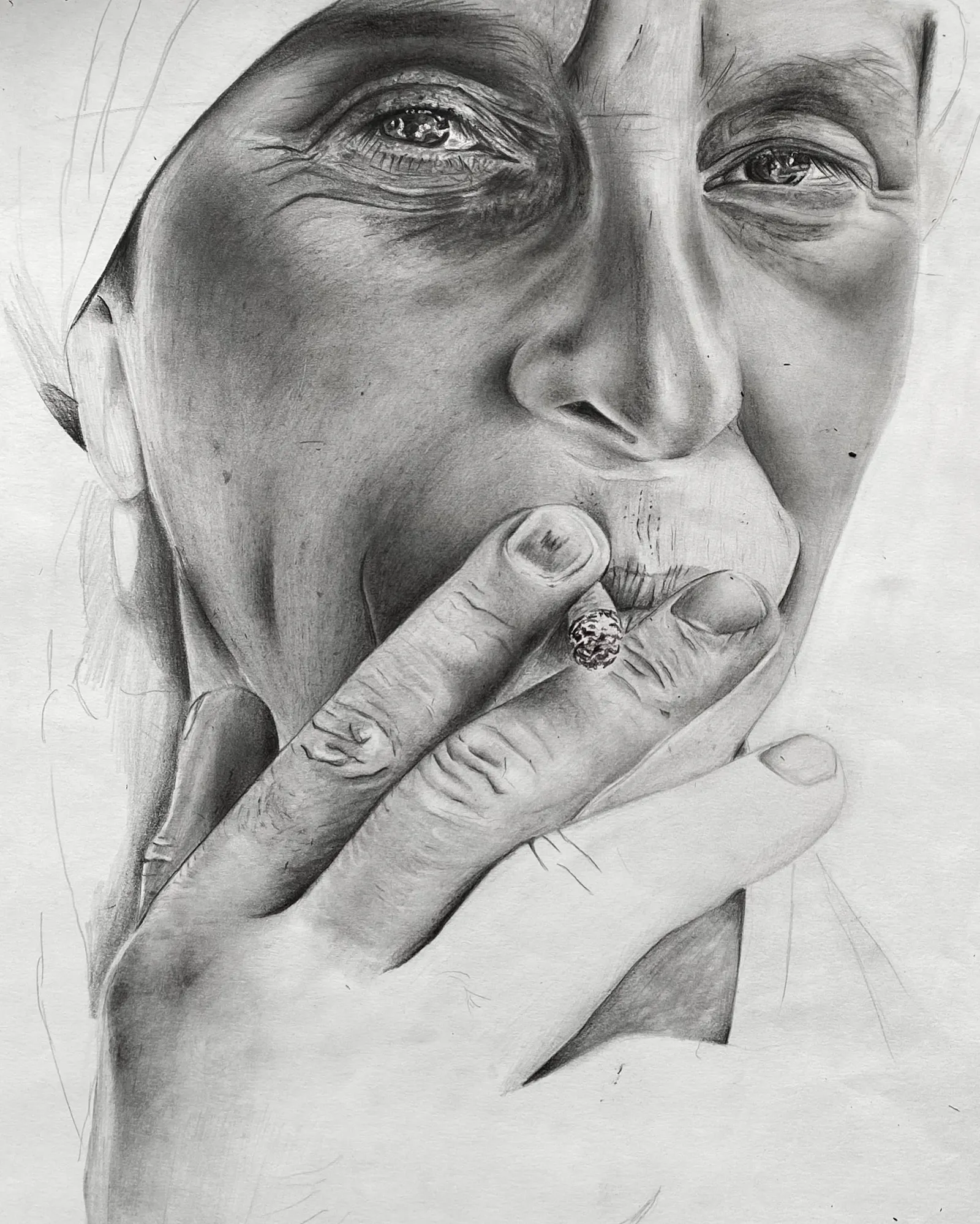 Zum Beispiel mit der Zeichnung ihrer Tante. „Auch meine Tante war Opfer politischer Verfolgung in der Türkei und floh nach Deutschland. Ich habe sie zuerst fotografiert und ihr gesagt, sie soll sich frei fühlen, das machen, was sie möchte. Sie fing an zu rauchen und direkt in die Kamera zu schauen. Für mich spiegelt ihre Haltung einen großen Widerstand: ‚Ich bin hier und lebe – trotz allem, was ich durchmachen musste‘. Mir war es wichtig, genau das zu zeigen.”